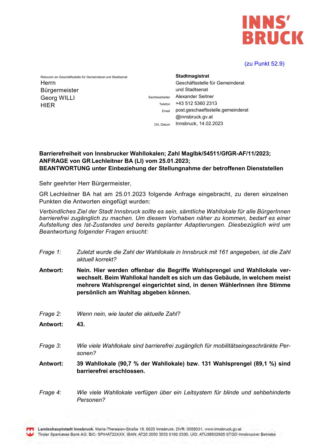 Barrierefreiheit von Innsbrucker Wahllokalen; Zahl MagIbk/54511/GfGR-AF/11/2023;