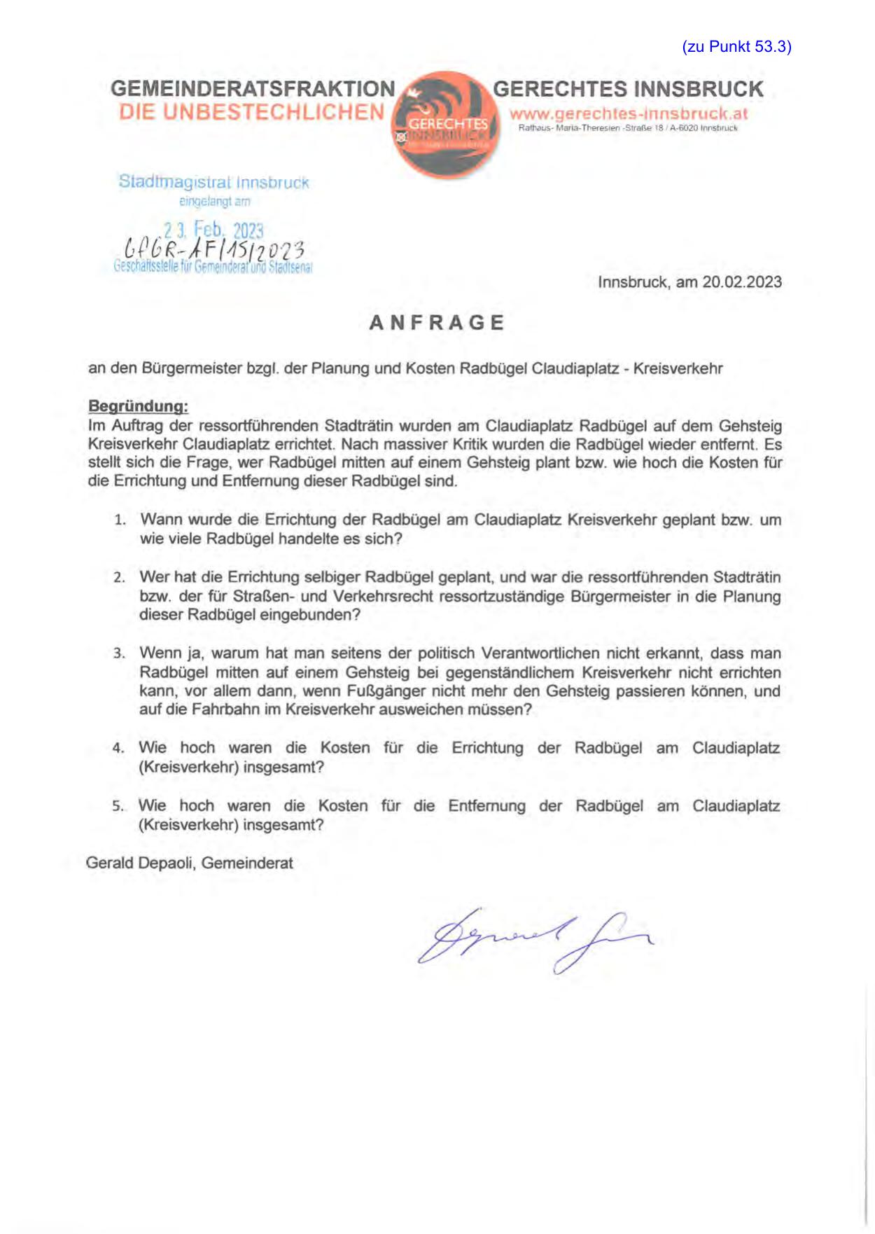 an den Bürgermeister bzgl. der Planung und Kosten Radbügel Claudiaplatz - Kreisverkehr