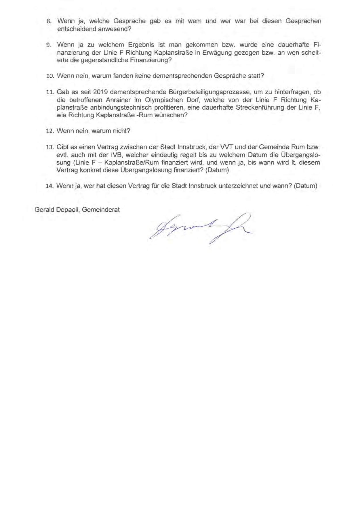 evtl. auch mit der IVB, welcher eindeutig regelt bis zu welchem Datum die Übergangslösung (Linie F - Kaplanstraße/Rum finanziert wird, und wenn ja, bis wann wird lt. diesem