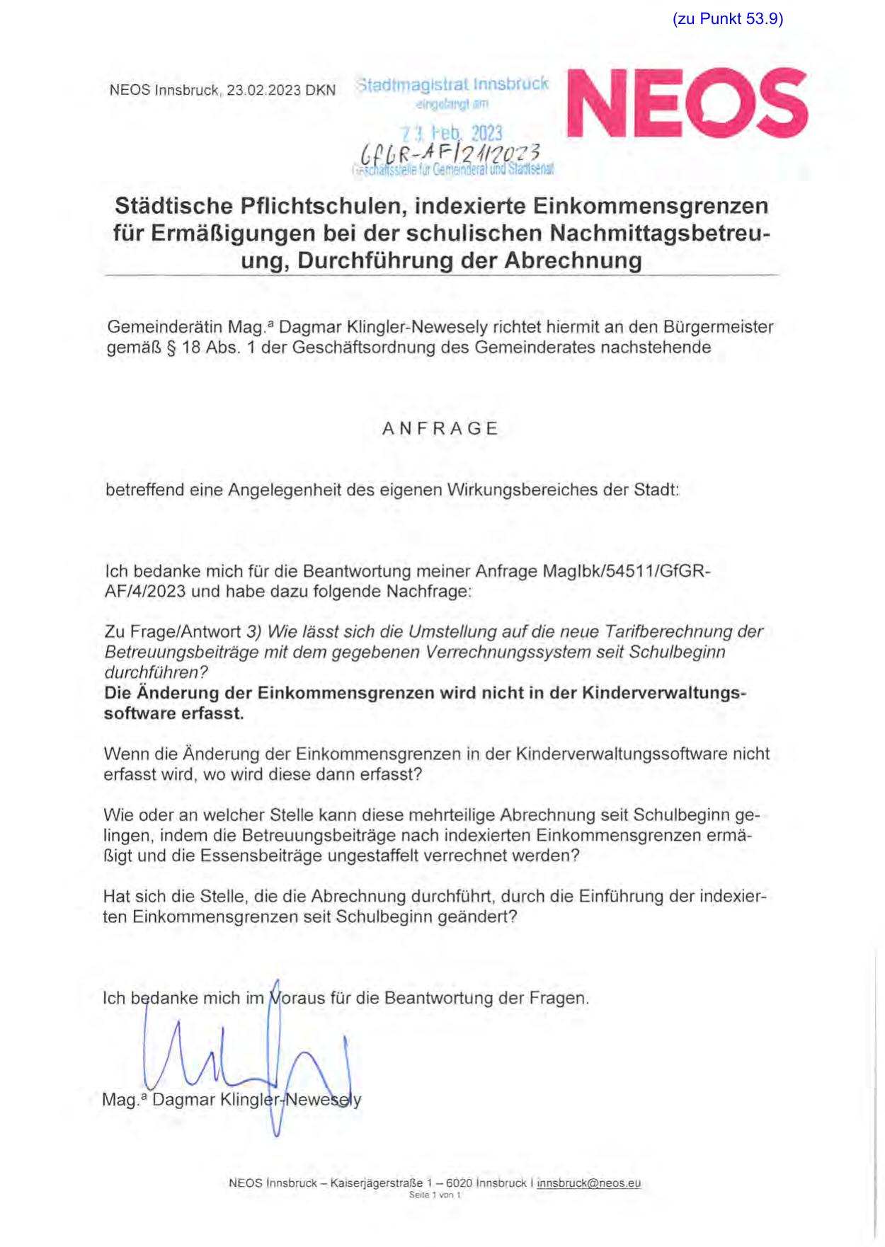 Gemeinderätin Mag.a Dagmar Klingler-Newesely richtet hiermit an den Bürgermeister