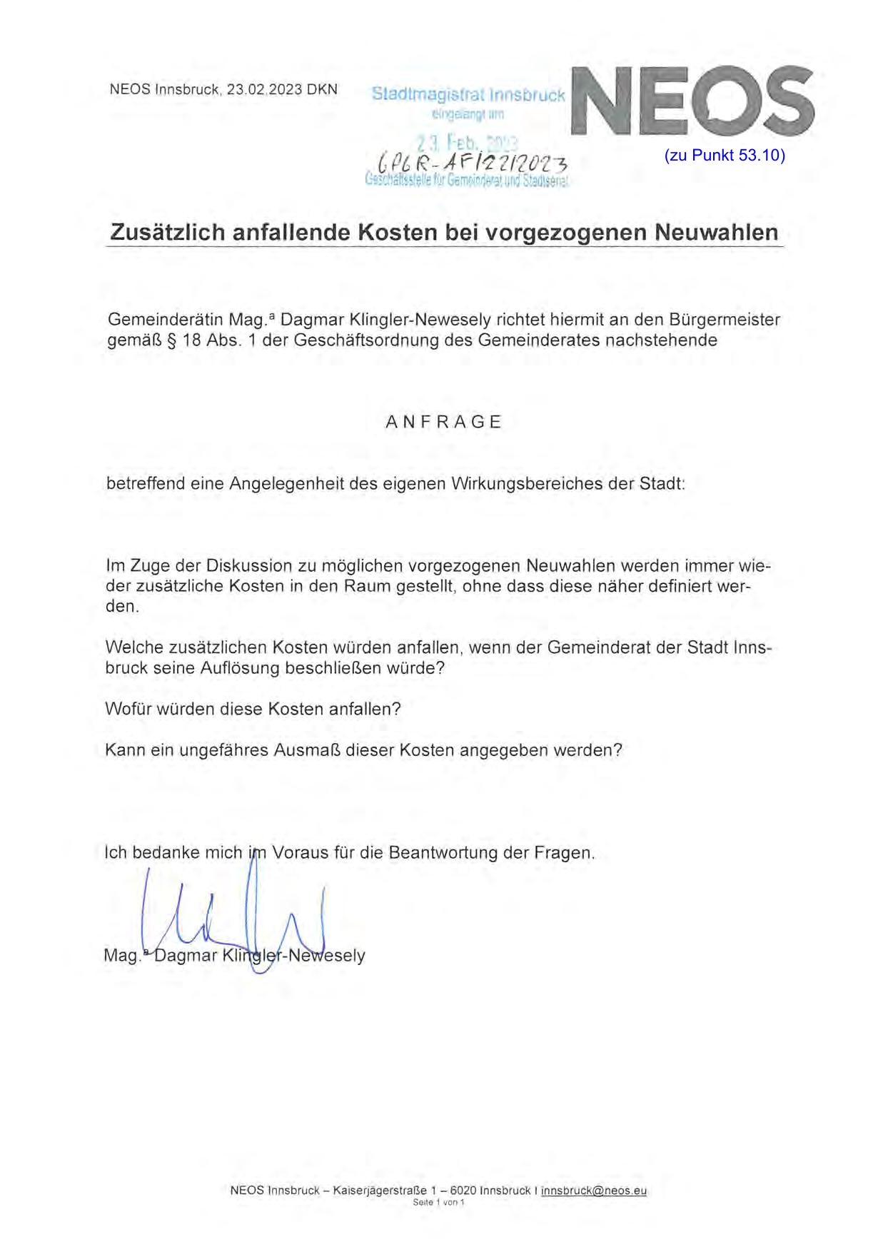 Gemeinderätin Mag.a Dagmar Klingler-Newesely richtet hiermit an den Bürgermeister