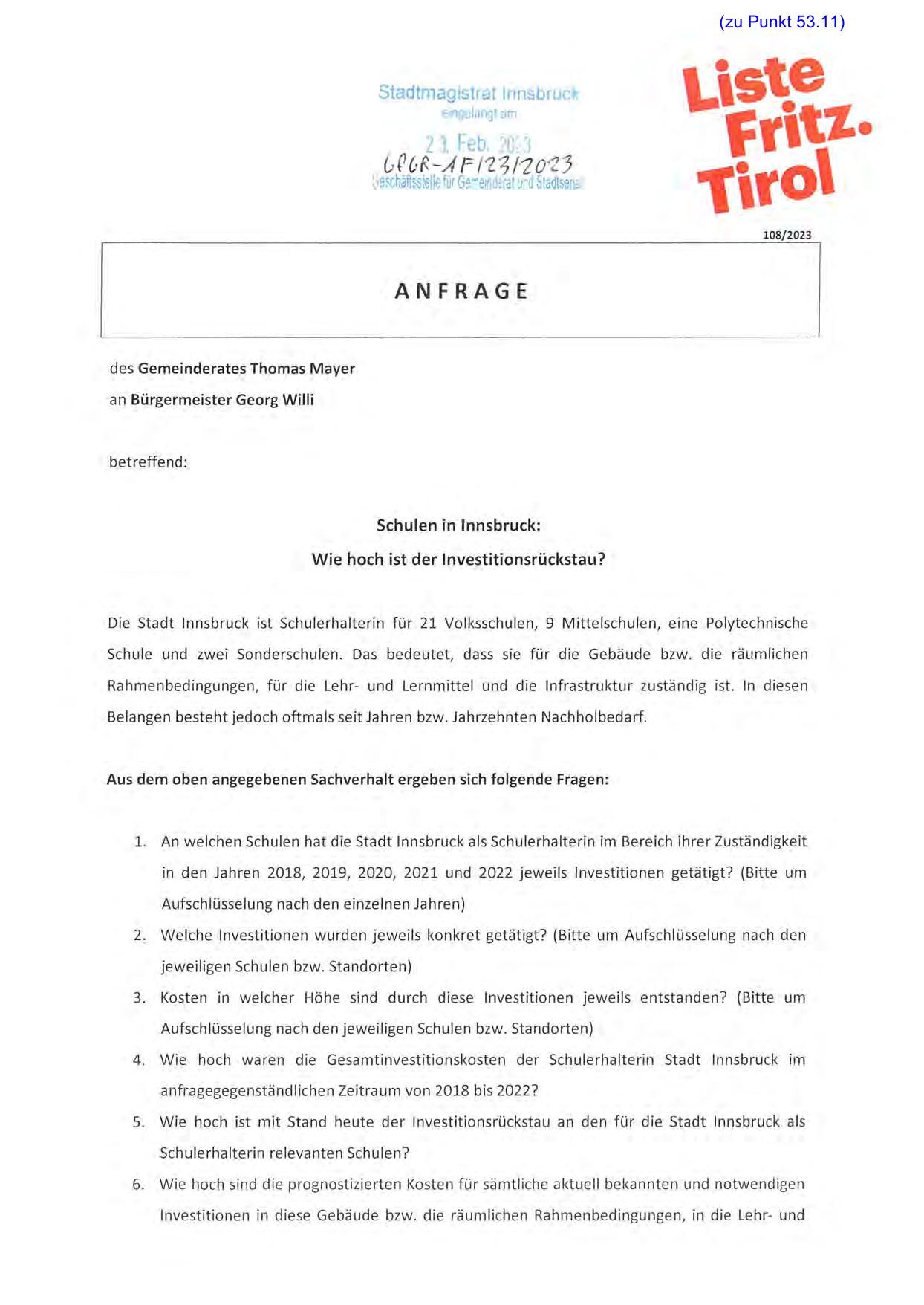 5. Wie hoch ist mit Stand heute der Investitionsrückstau an den für die Stadt Innsbruck als