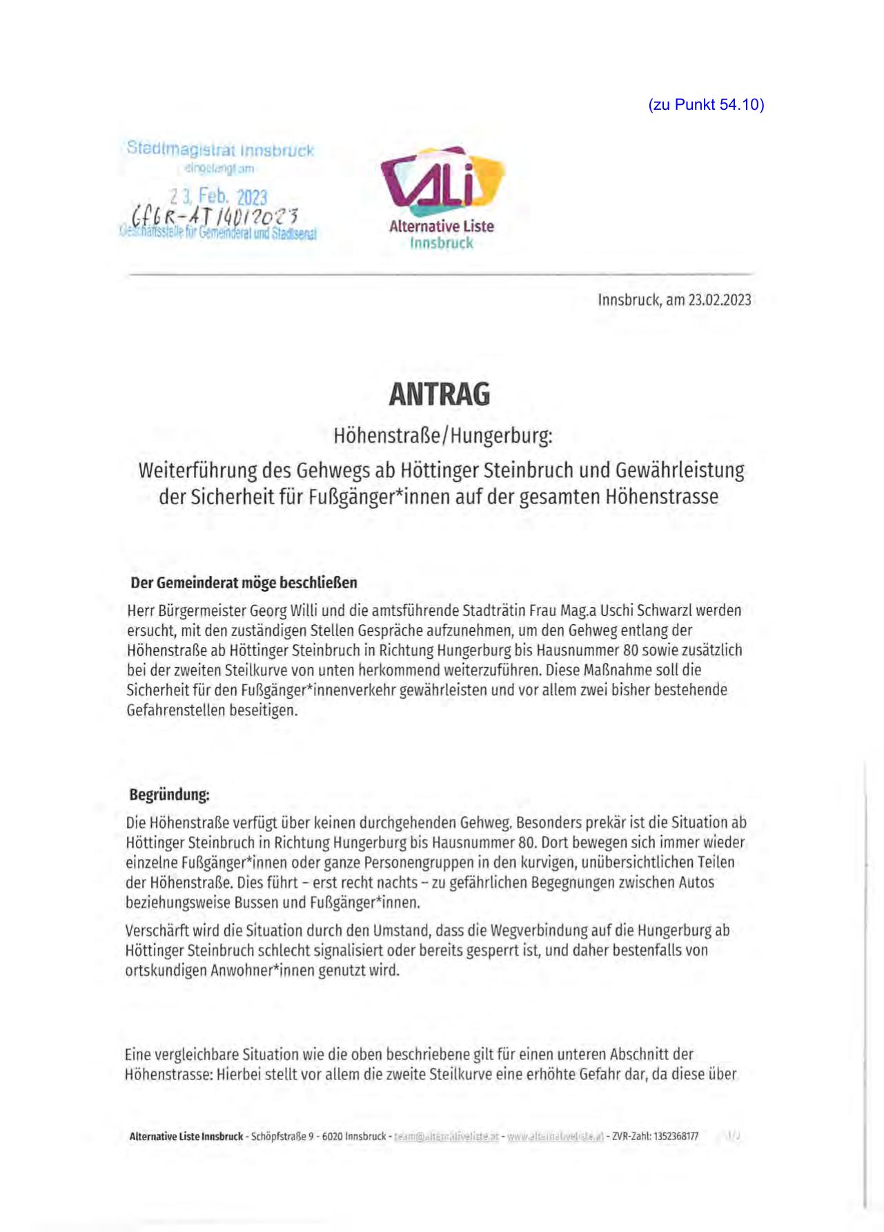 Höhenstraße ab Höttinger Steinbruch in Richtung Hungerburg bis Hausnummer 80 sowie zusätzlich