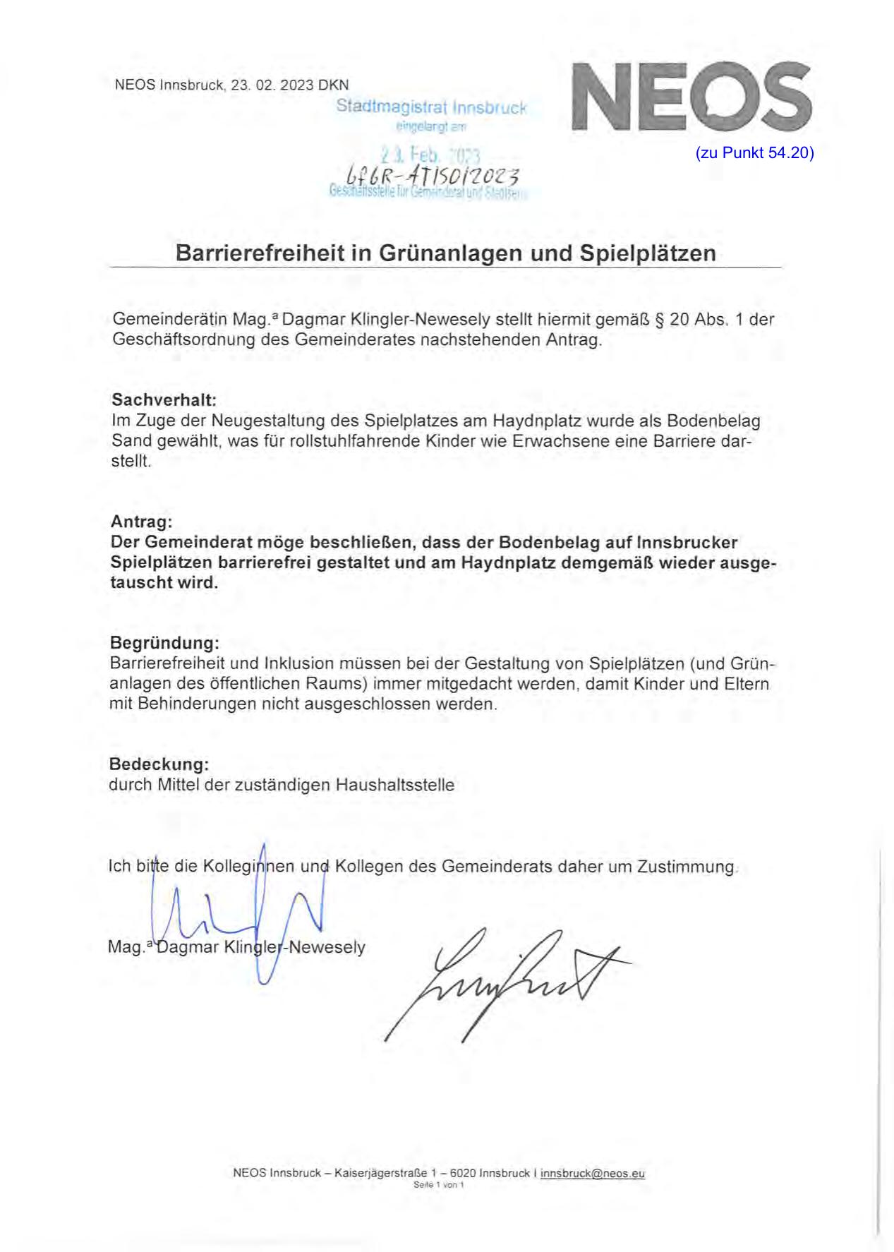 Gemeinderätin Mag.a Dagmar Klingler-Newesely stellt hiermit gemäß§ 20 Abs. 1 der