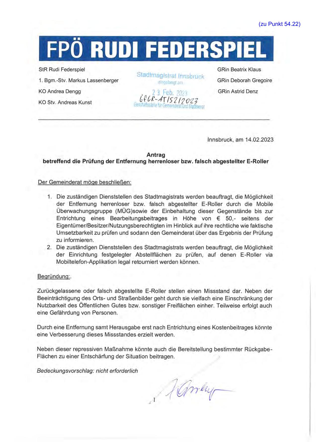 betreffend die Prüfung der Entfernung herrenloser bzw. falsch abgestellter E-Roller