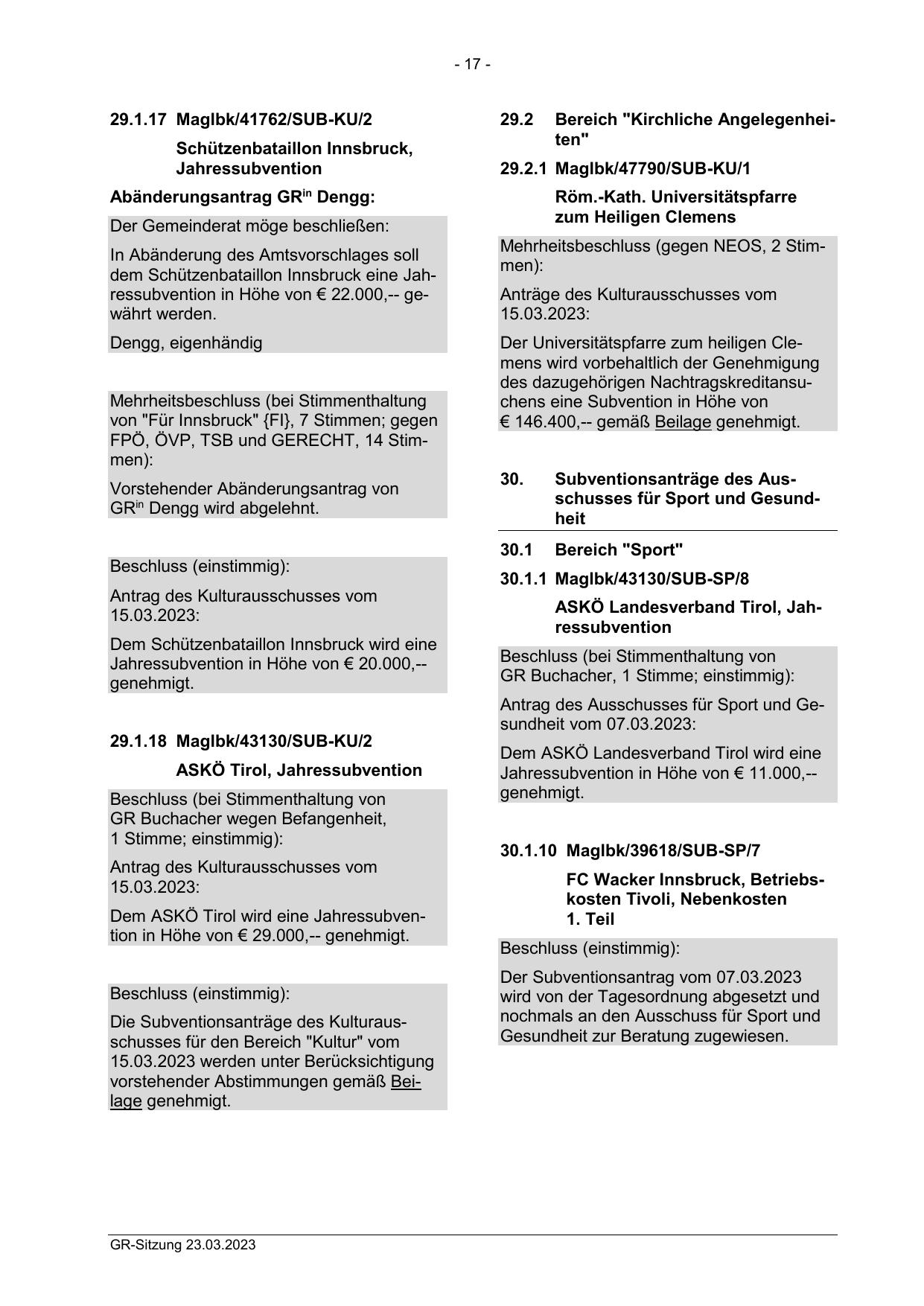 Dem ASKÖ Tirol wird eine Jahressubvention in Höhe von € 29.000,-- genehmigt.