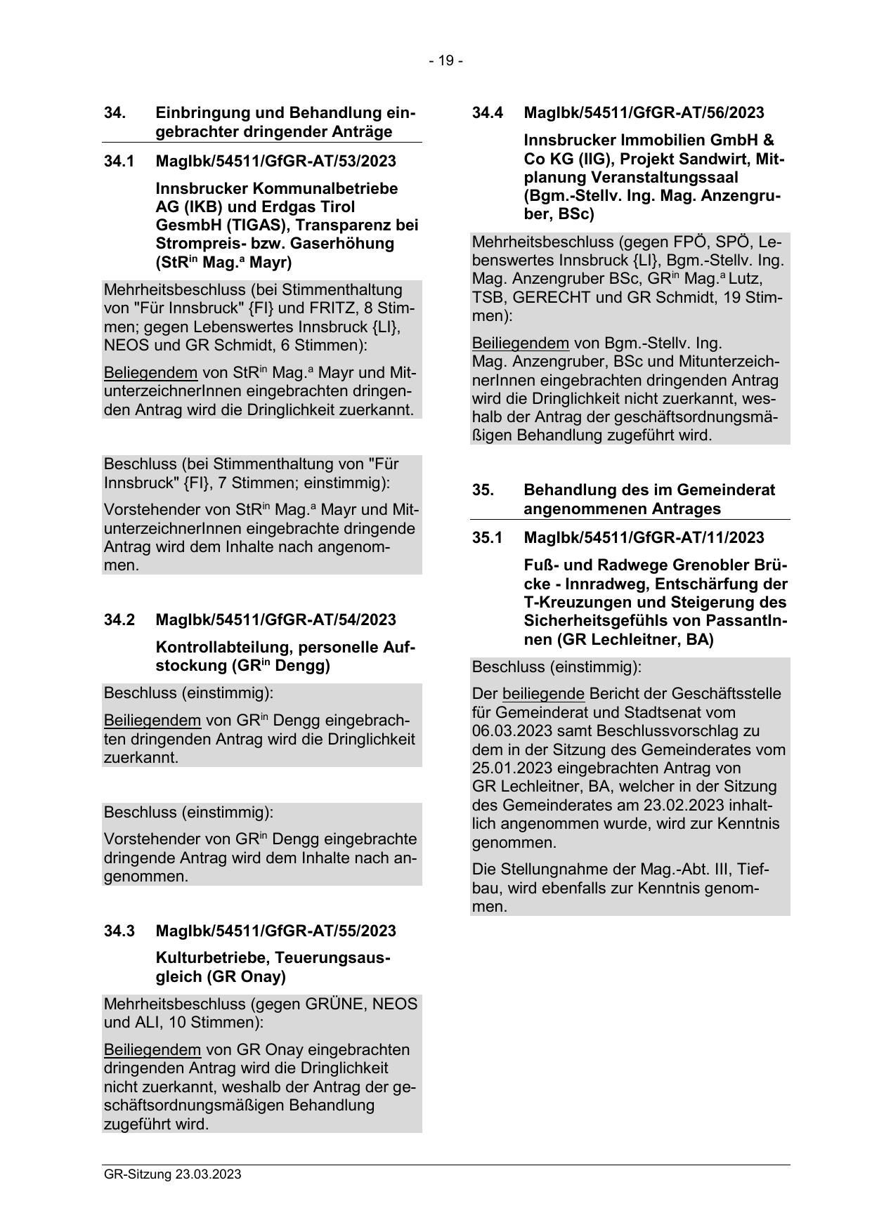 Mehrheitsbeschluss (gegen FPÖ, SPÖ, Lebenswertes Innsbruck {LI}, Bgm.-Stellv. Ing.