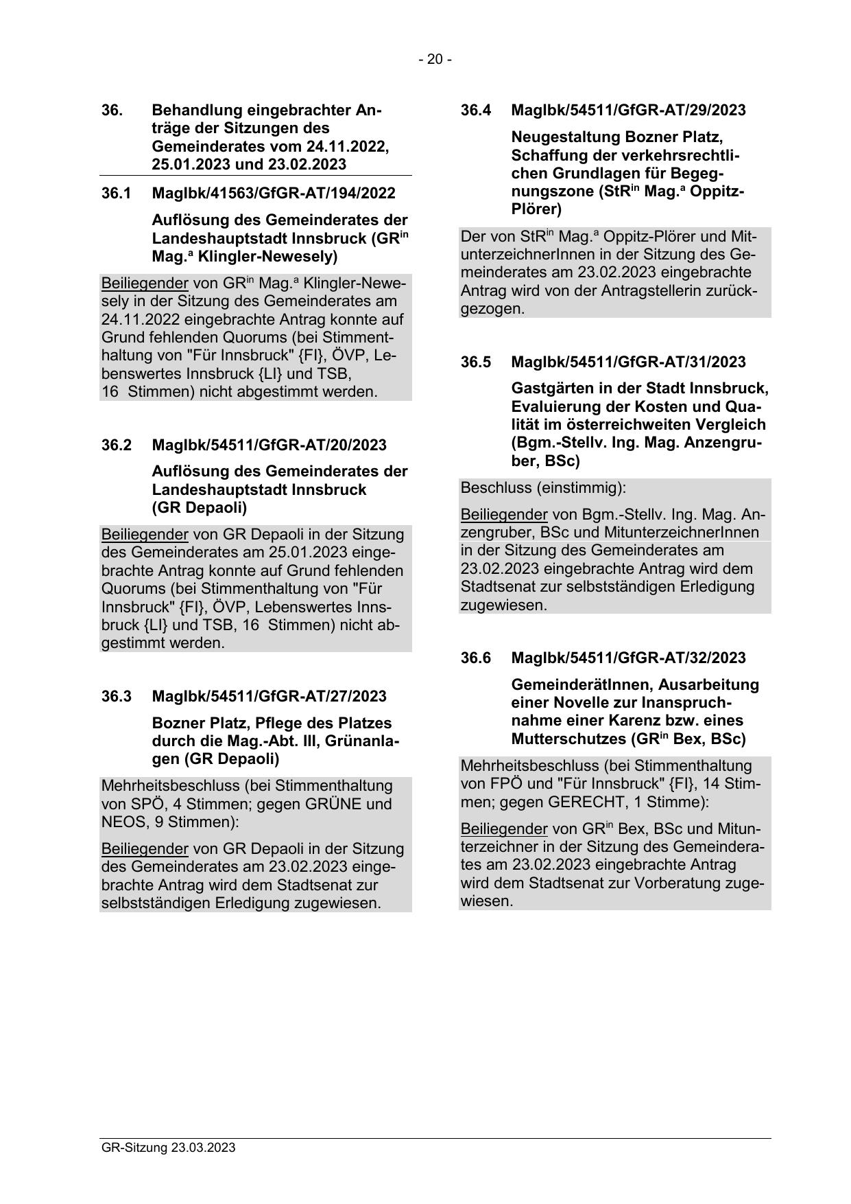 Innsbruck" {FI}, ÖVP, Lebenswertes Innsbruck {LI} und TSB, 16 Stimmen) nicht abgestimmt werden.