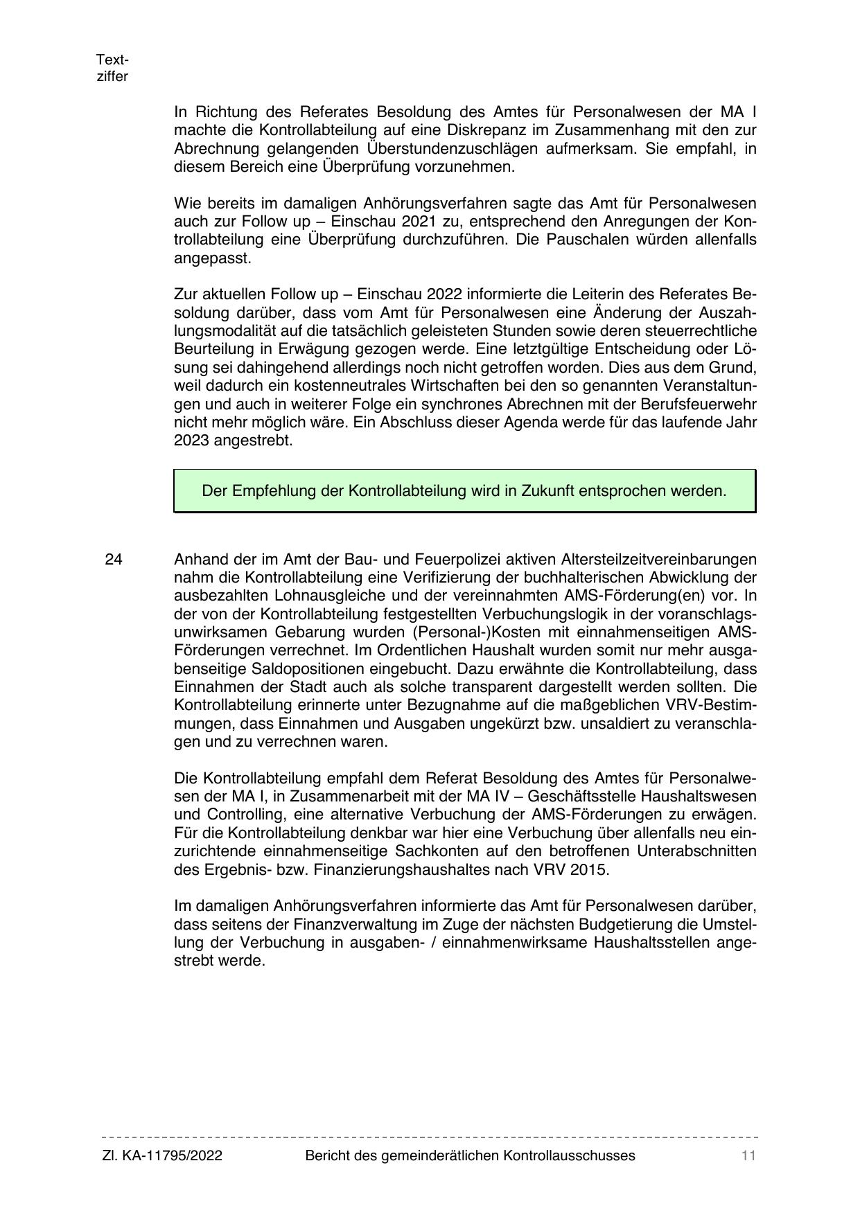 Die Kontrollabteilung empfahl dem Referat Besoldung des Amtes für Personalwesen der MA I, in Zusammenarbeit mit der MA IV – Geschäftsstelle Haushaltswesen