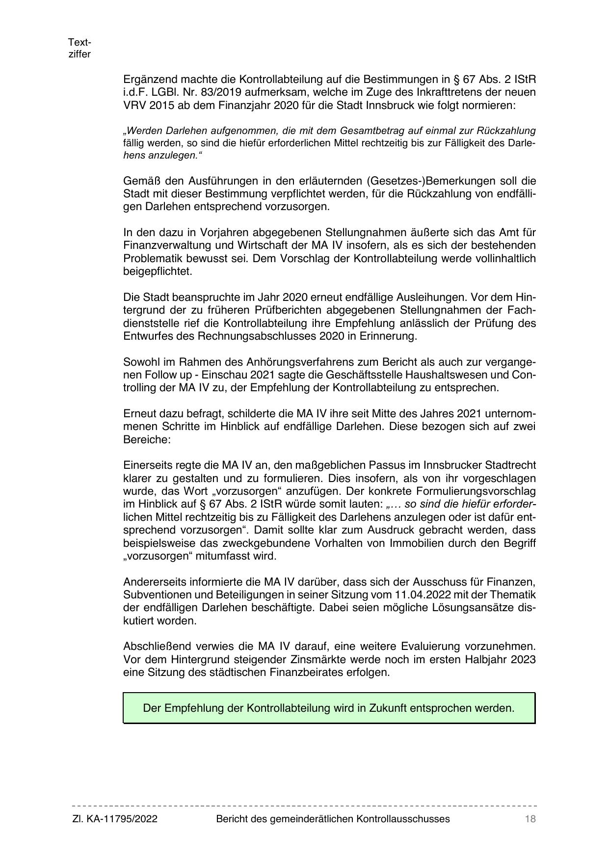 Erneut dazu befragt, schilderte die MA IV ihre seit Mitte des Jahres 2021 unternommenen Schritte im Hinblick auf endfällige Darlehen. Diese bezogen sich auf zwei