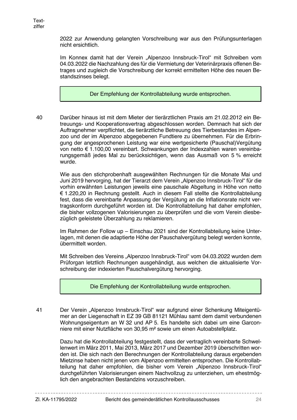 Mietzinse haben nicht jenen vom Alpenzoo ermittelten entsprochen. Die Kontrollabteilung hat daher empfohlen, die bisher vom Verein „Alpenzoo Innsbruck-Tirol“