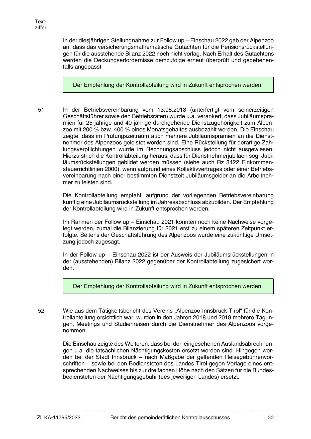 zeigte, dass im Prüfungszeitraum auch mehrere Jubiläumsprämien an die Dienstnehmer des Alpenzoos geleistet worden sind. Eine Rückstellung für derartige Zahlungsverpflichtungen wurde im Rechnungsabschluss jedoch nicht ausgewiesen.