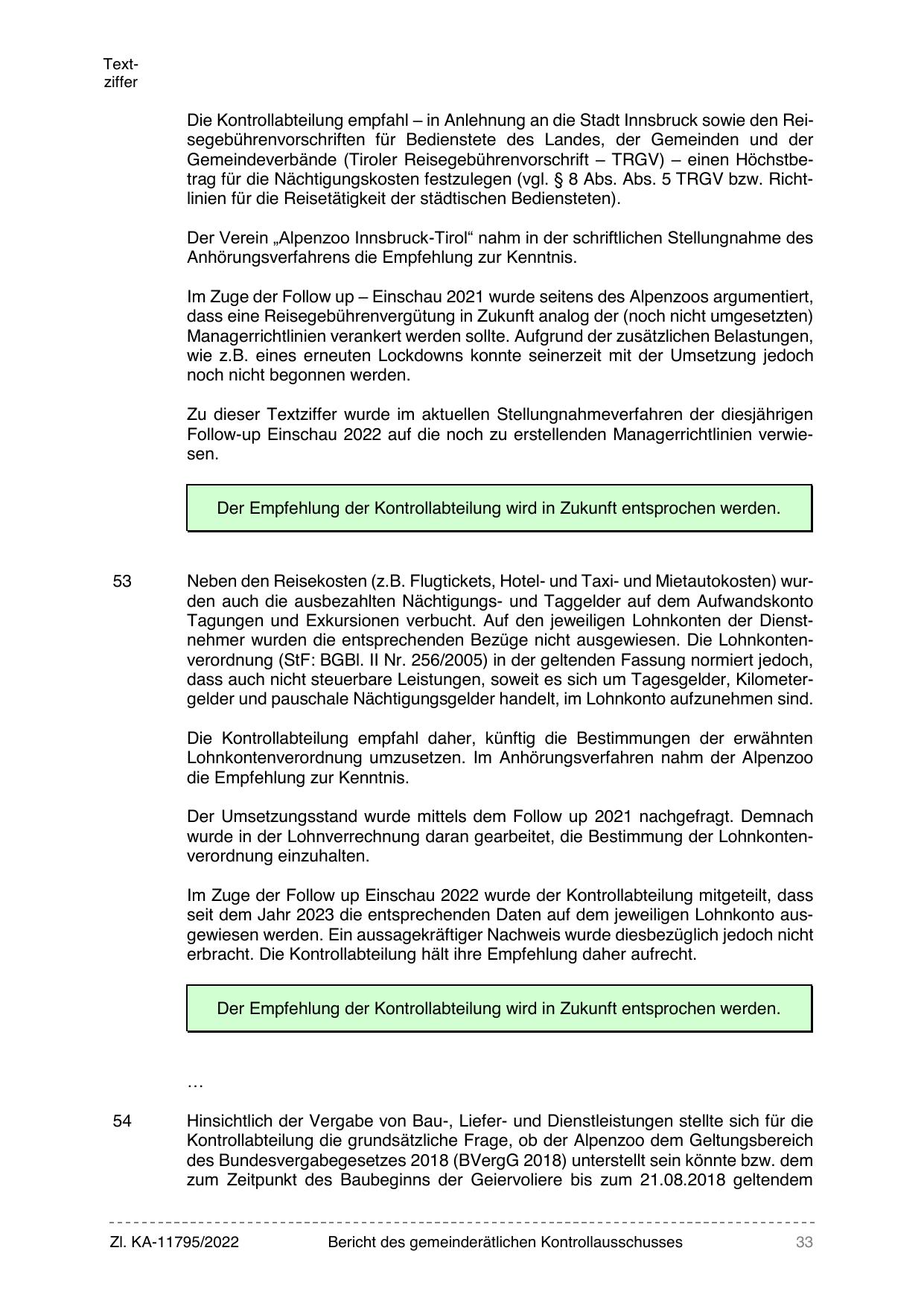 Die Kontrollabteilung empfahl – in Anlehnung an die Stadt Innsbruck sowie den Reisegebührenvorschriften für Bedienstete des Landes, der Gemeinden und der