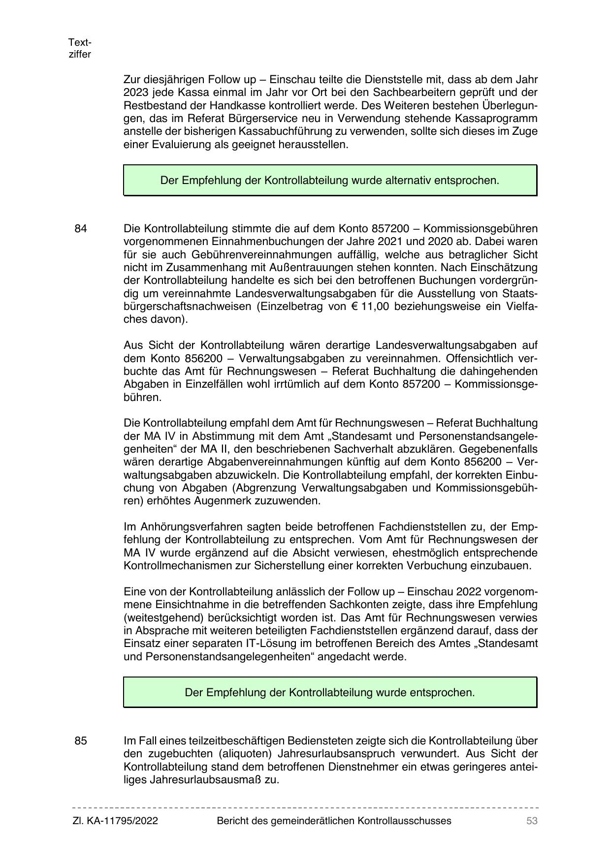 wären derartige Abgabenvereinnahmungen künftig auf dem Konto 856200 – Verwaltungsabgaben abzuwickeln. Die Kontrollabteilung empfahl, der korrekten Einbuchung von Abgaben (Abgrenzung Verwaltungsabgaben und Kommissionsgebühren) erhöhtes Augenmerk zuzuwenden.