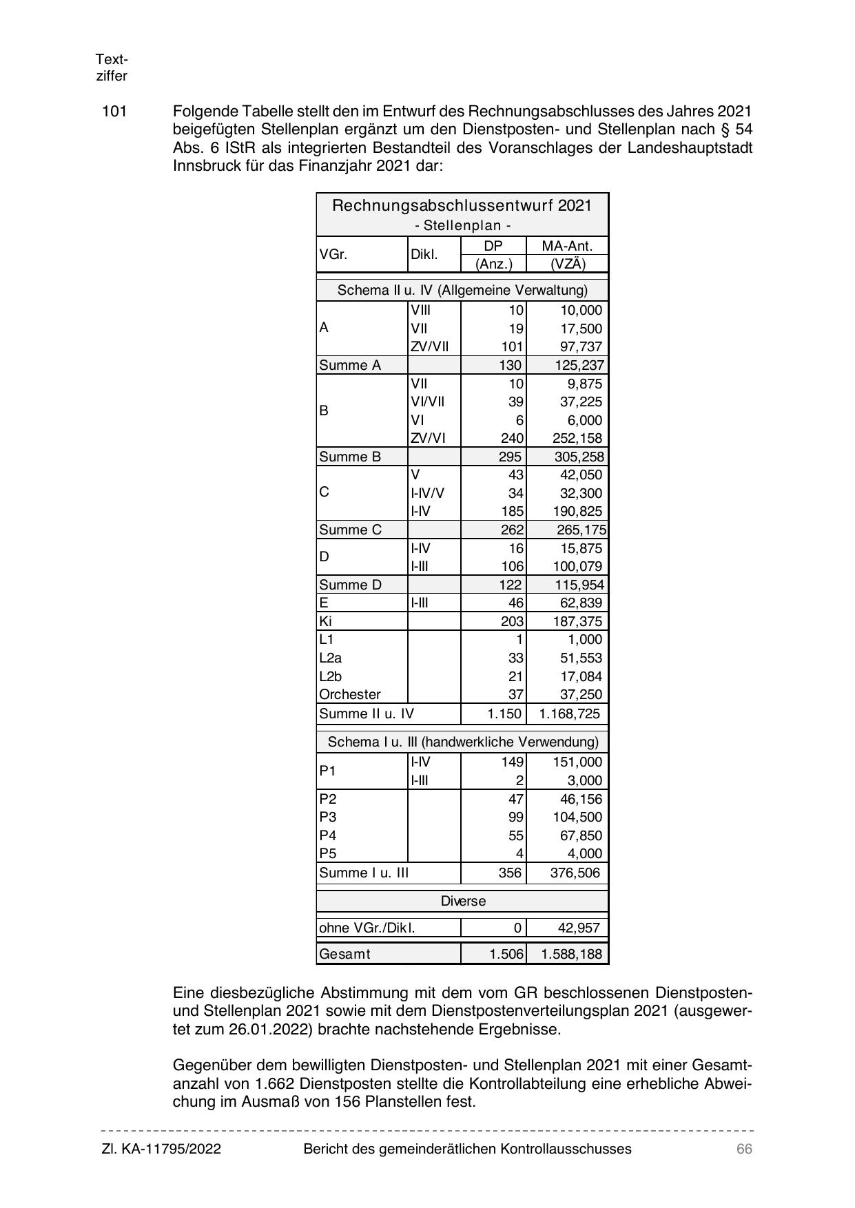 Gegenüber dem bewilligten Dienstposten- und Stellenplan 2021 mit einer Gesamtanzahl von 1.662 Dienstposten stellte die Kontrollabteilung eine erhebliche Abweichung im Ausmaß von 156 Planstellen fest.
