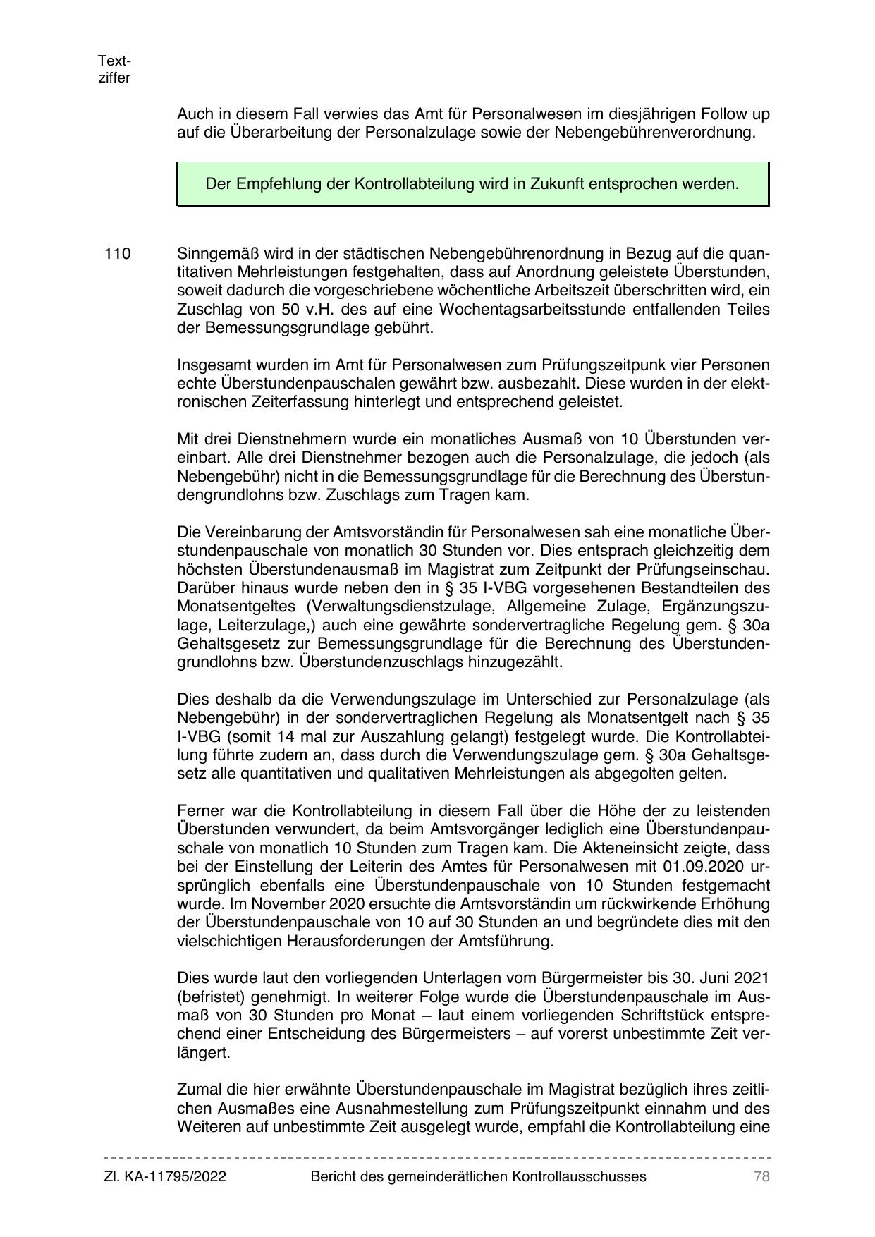 Zumal die hier erwähnte Überstundenpauschale im Magistrat bezüglich ihres zeitlichen Ausmaßes eine Ausnahmestellung zum Prüfungszeitpunkt einnahm und des