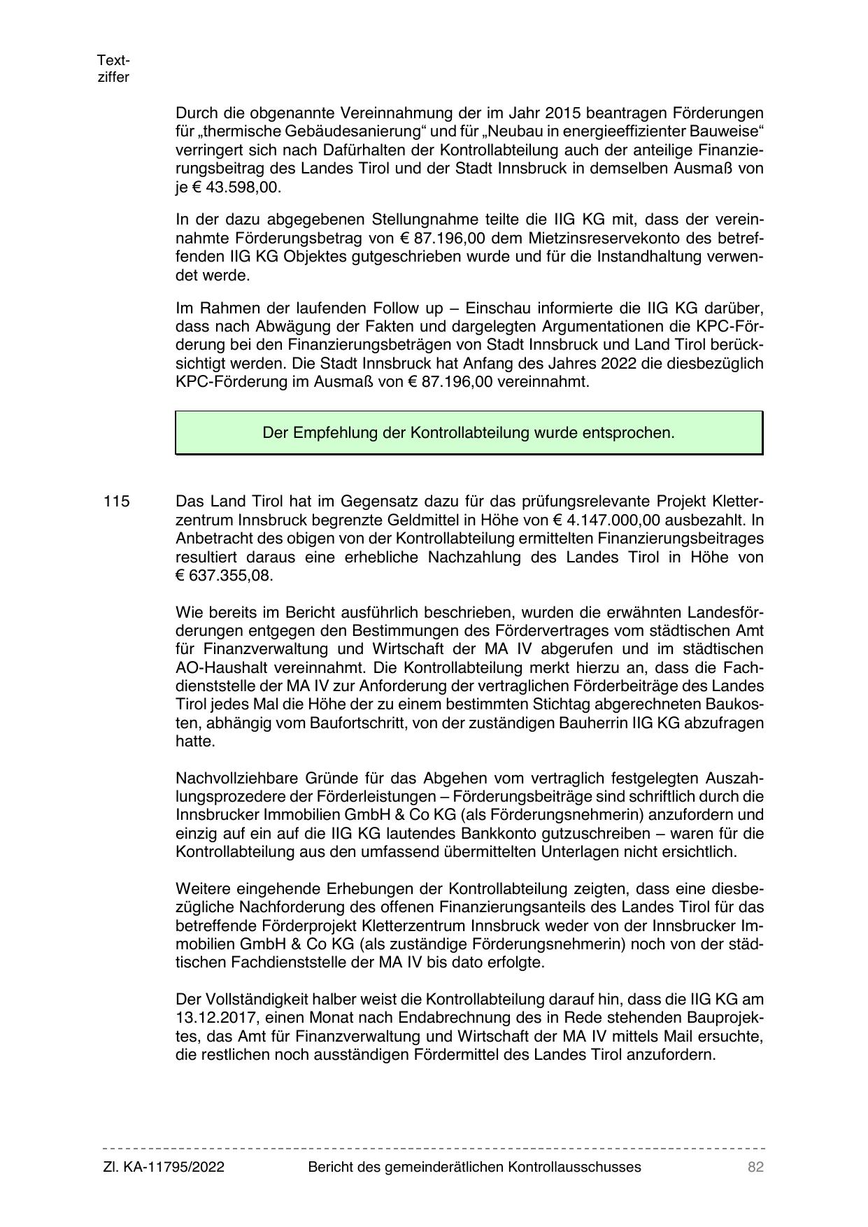 betreffende Förderprojekt Kletterzentrum Innsbruck weder von der Innsbrucker Immobilien GmbH & Co KG (als zuständige Förderungsnehmerin) noch von der städtischen Fachdienststelle der MA IV bis dato erfolgte.
