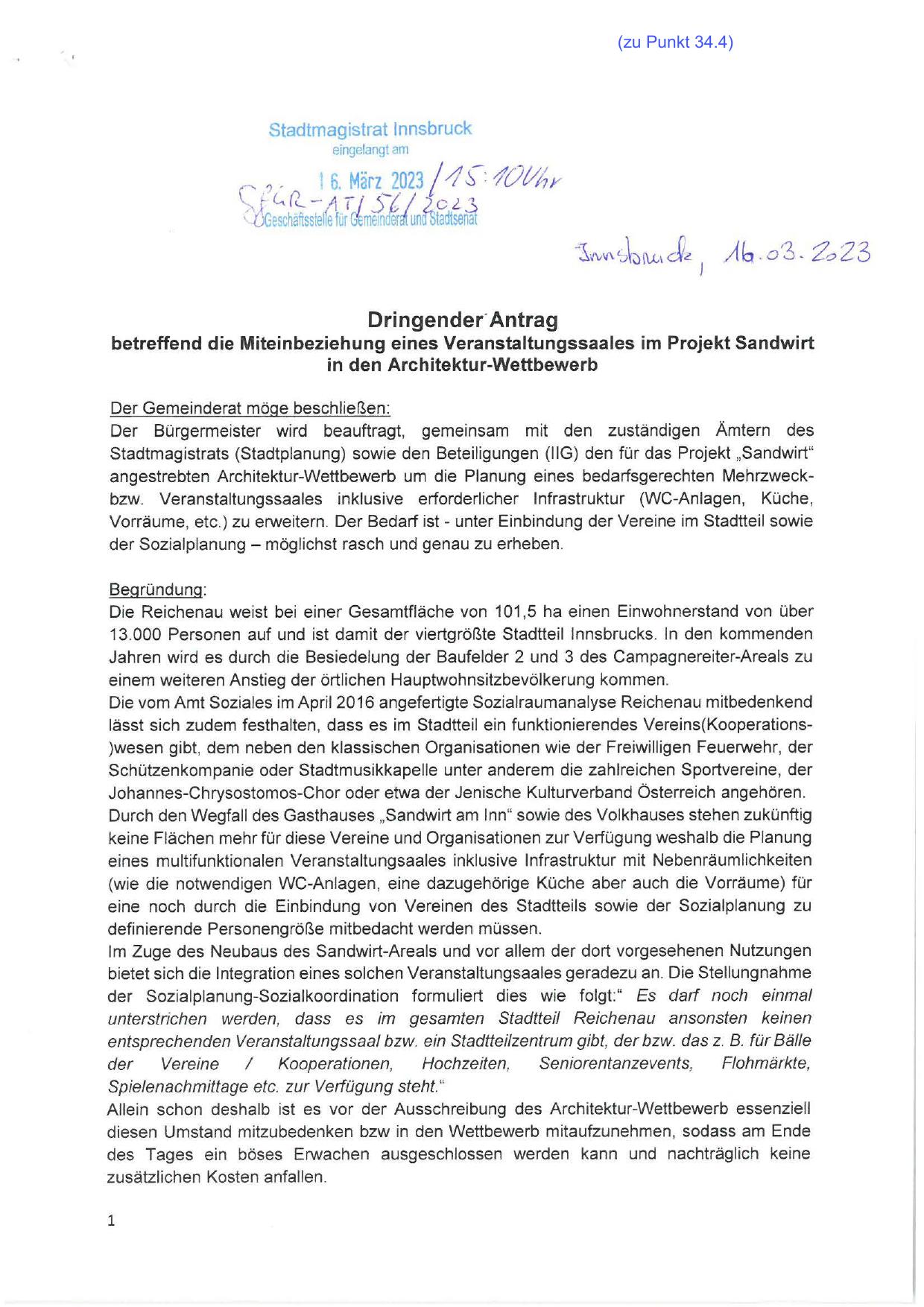 betreffend die Miteinbeziehung eines Veranstaltungssaales im Projekt Sandwirt