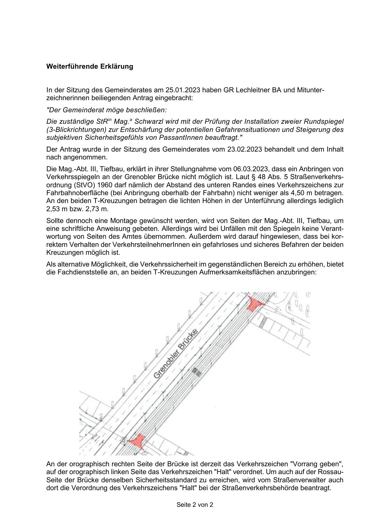 eine schriftliche Anweisung gebeten. Allerdings wird bei Unfällen mit den Spiegeln keine Verantwortung von Seiten des Amtes übernommen. Außerdem wird darauf hingewiesen, dass bei korrektem Verhalten der VerkehrsteilnehmerInnen ein gefahrloses und sicheres Befahren der beiden