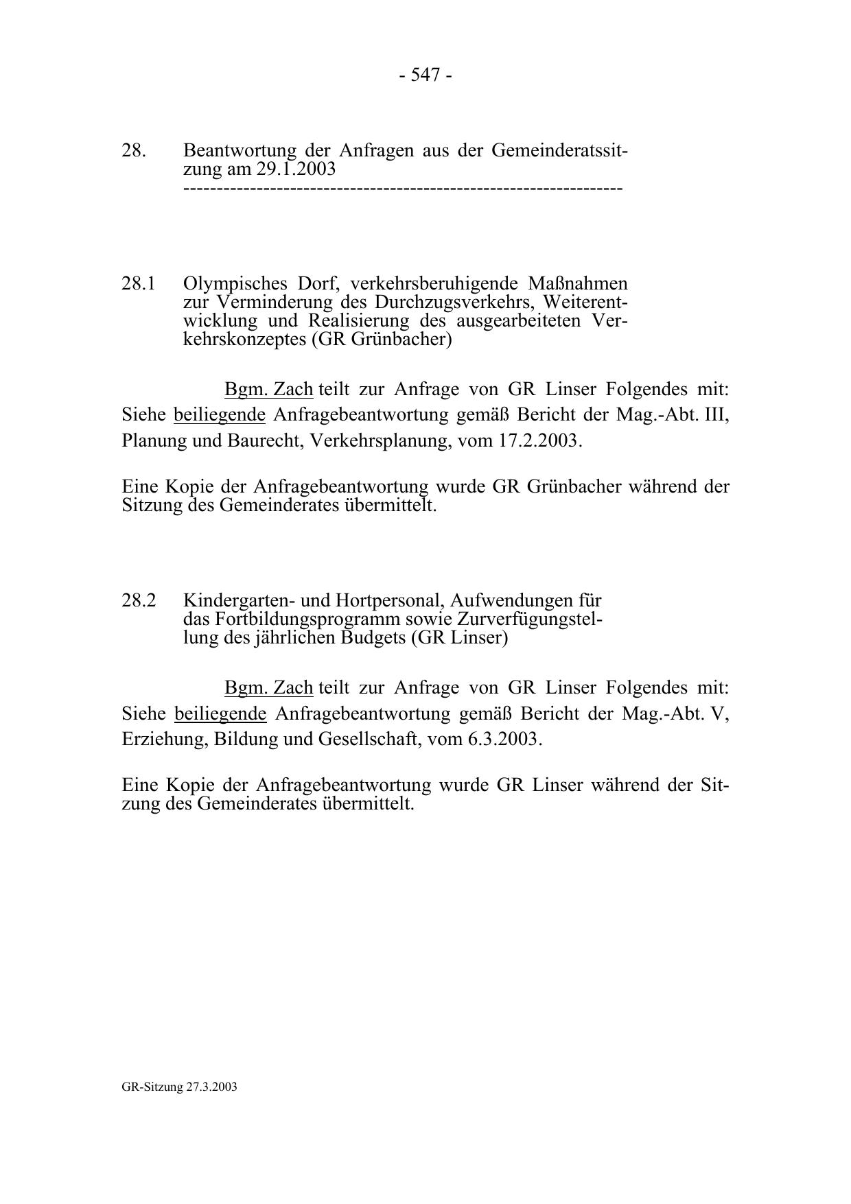 Beantwortung der Anfragen aus der Gemeinderatssitzung am 29.1.2003