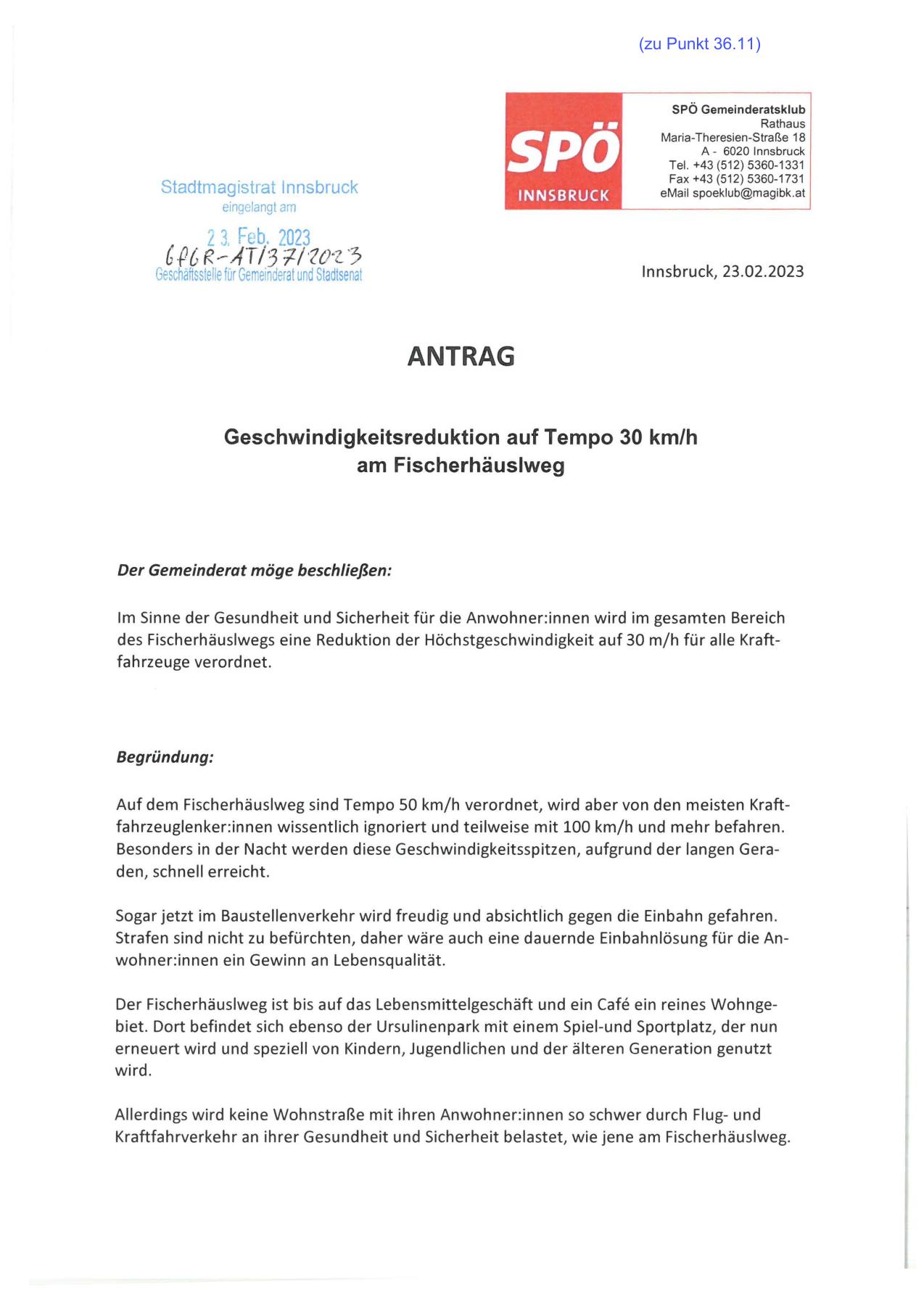 des Fischerhäuslwegs eine Reduktion der Höchstgeschwindigkeit auf 30 m/h für alle Kraftfahrzeuge verordnet.