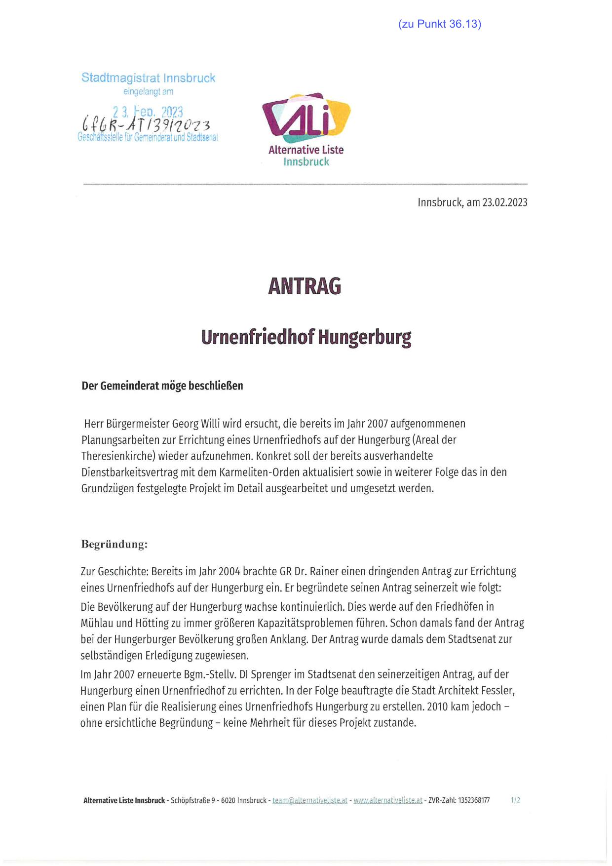 einen Plan für die Realisierung eines Urnenfriedhofs Hungerburg zu erstellen. 2010 kam jedoch ohne ersichtliche Begründung- keine Mehrheit für dieses Projekt zustande.