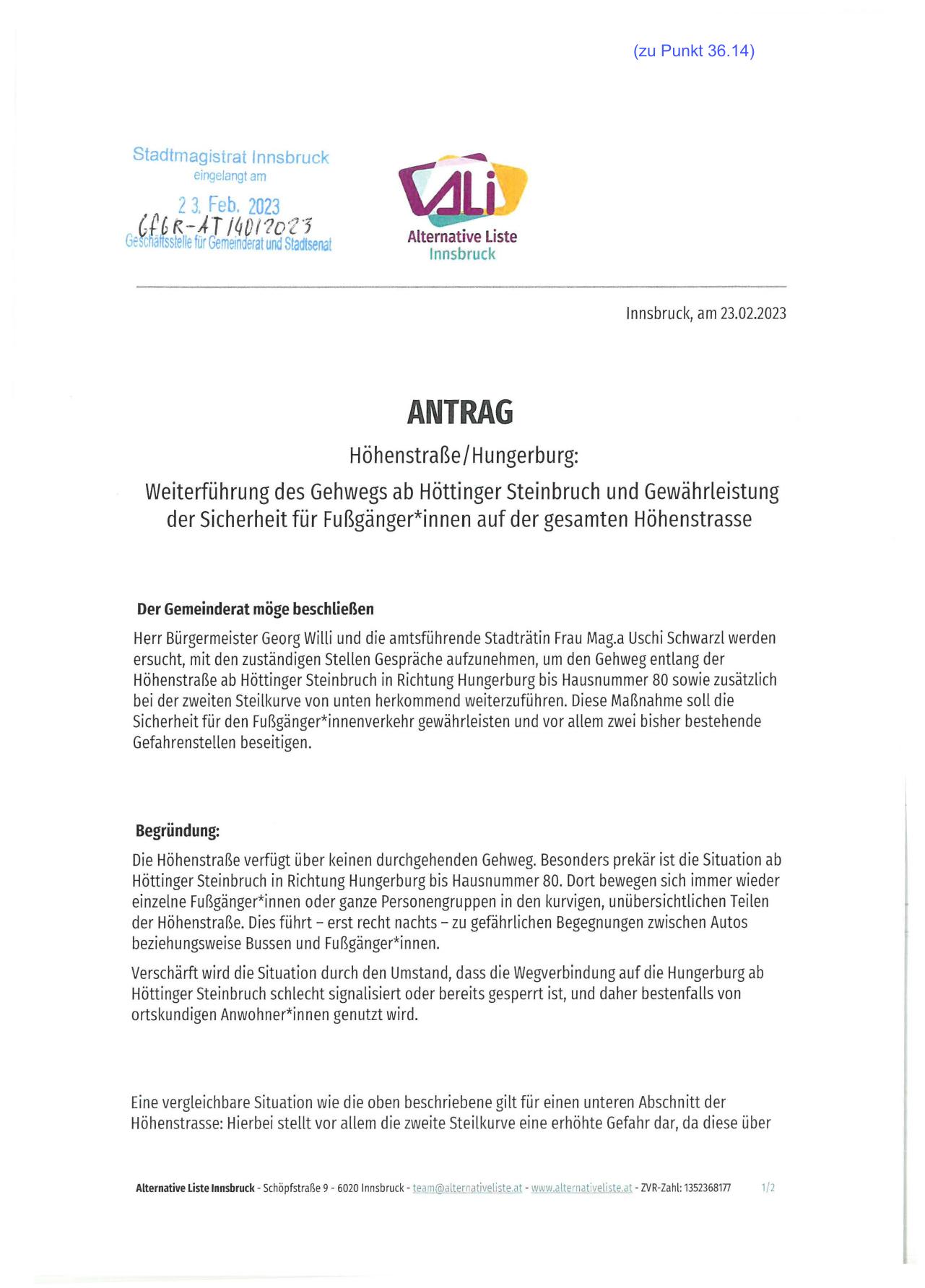 der Sicherheit für Fußgänger*innen auf der gesamten Höhenstrasse
