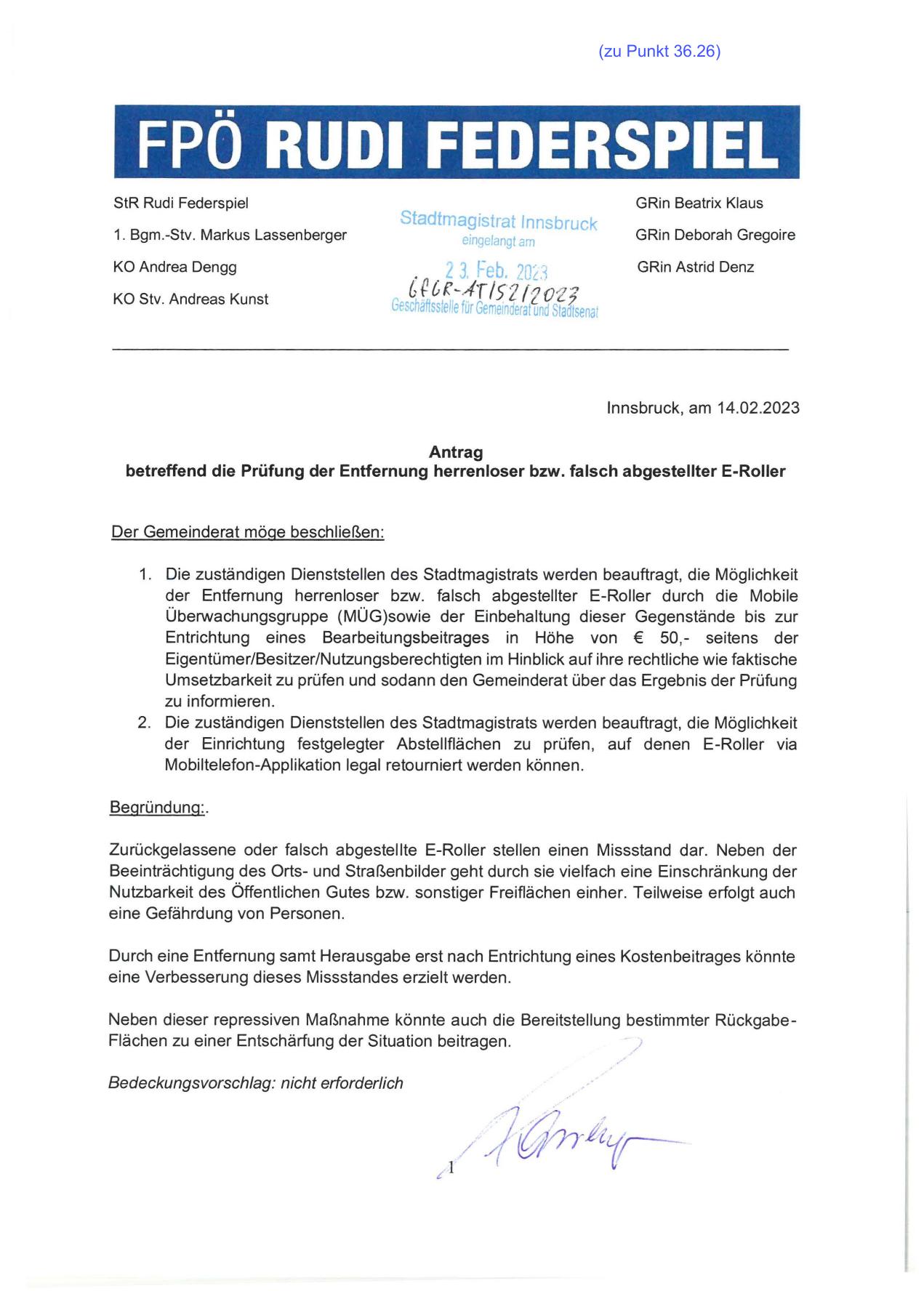 betreffend die Prüfung der Entfernung herrenloser bzw. falsch abgestellter E-Roller