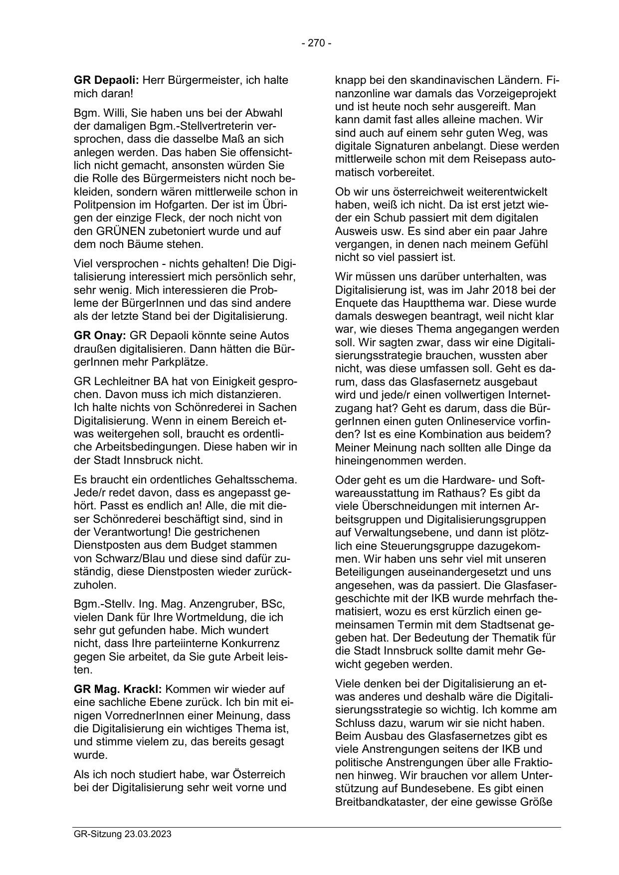 angesehen, was da passiert. Die Glasfasergeschichte mit der IKB wurde mehrfach thematisiert, wozu es erst kürzlich einen gemeinsamen Termin mit dem Stadtsenat gegeben hat. Der Bedeutung der Thematik für