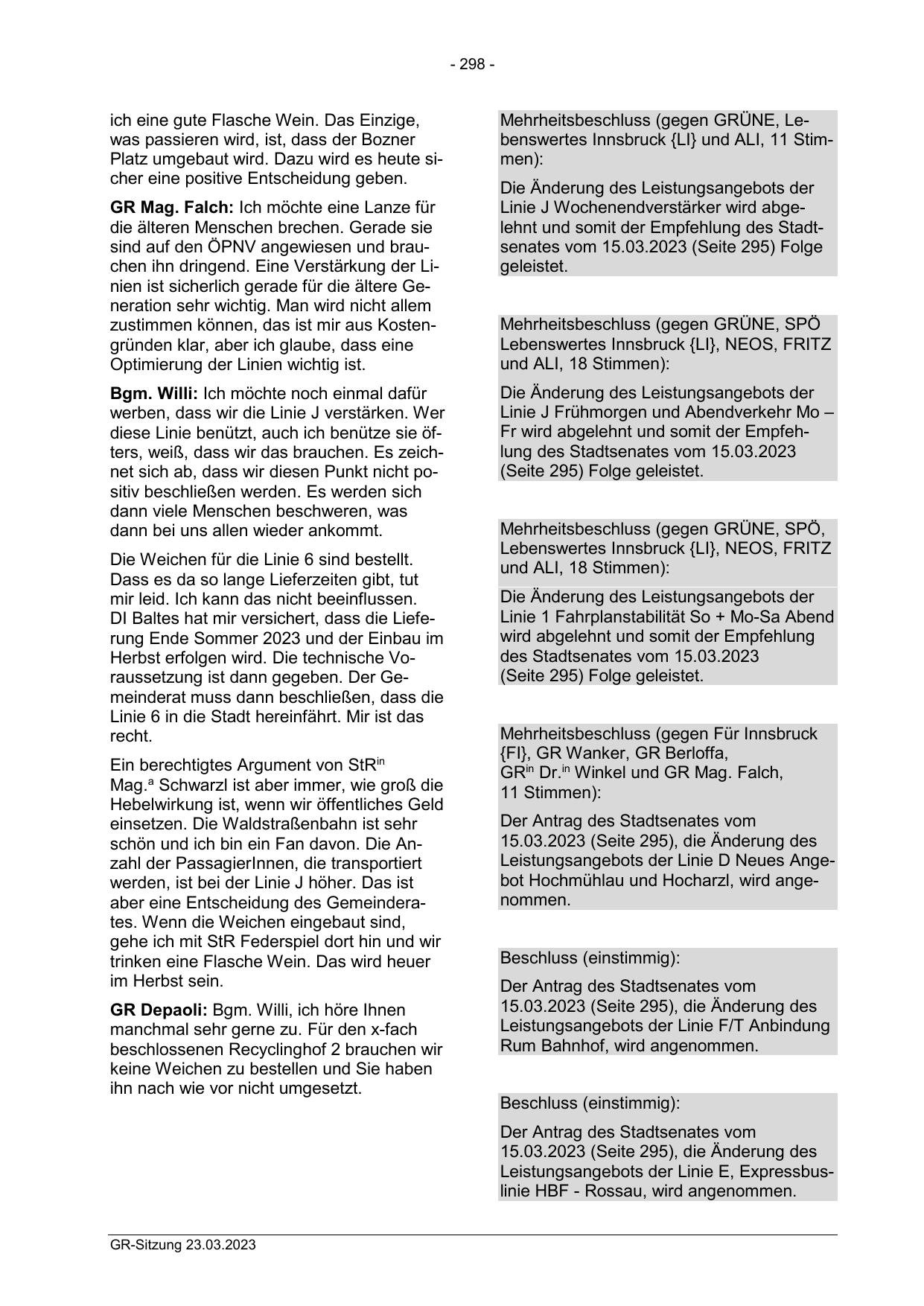 Mehrheitsbeschluss (gegen GRÜNE, Lebenswertes Innsbruck {LI} und ALI, 11 Stimmen):
