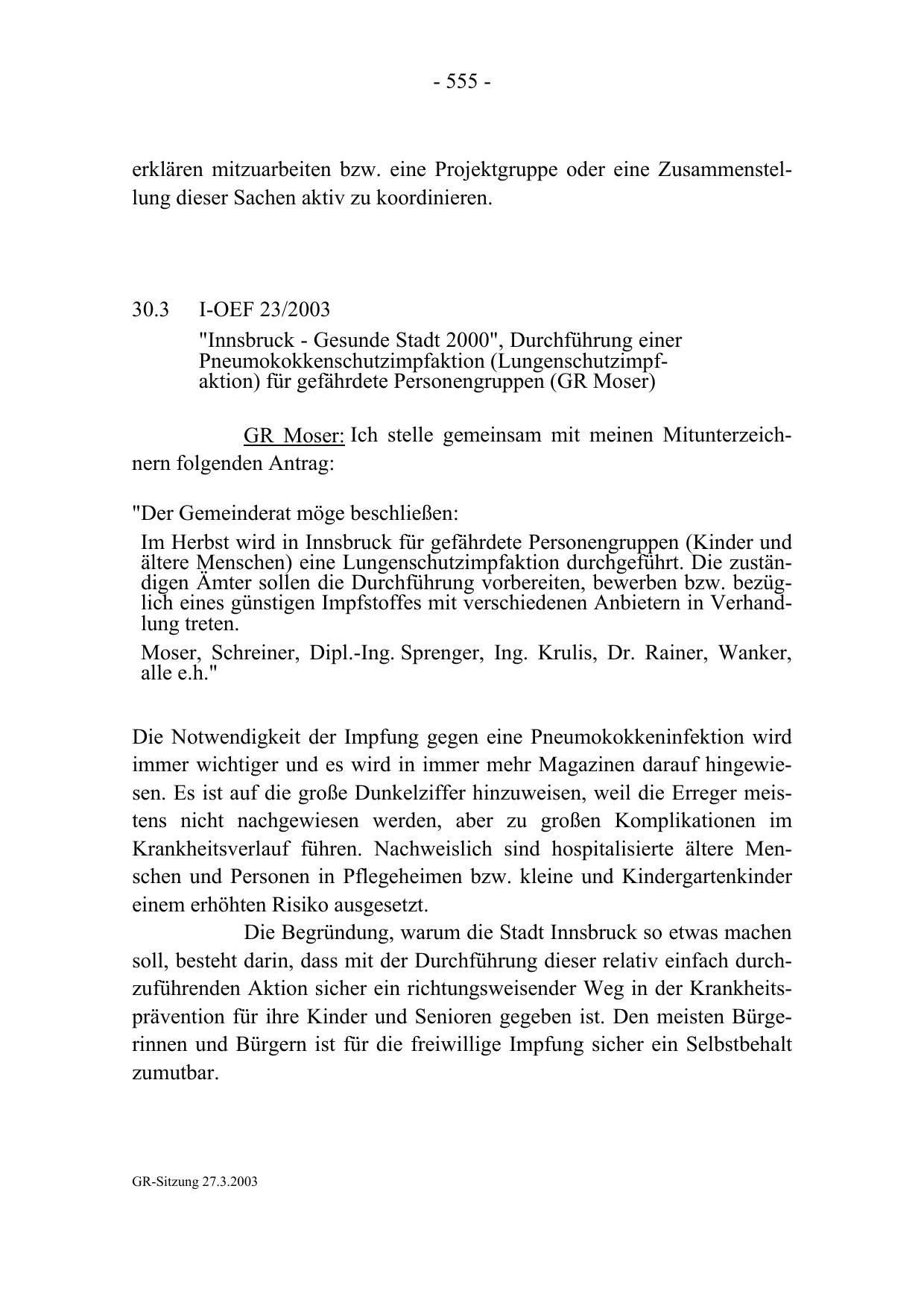 ältere Menschen) eine Lungenschutzimpfaktion durchgeführt. Die zuständigen Ämter sollen die Durchführung vorbereiten, bewerben bzw. bezüglich eines günstigen Impfstoffes mit verschiedenen Anbietern in Verhandlung treten.