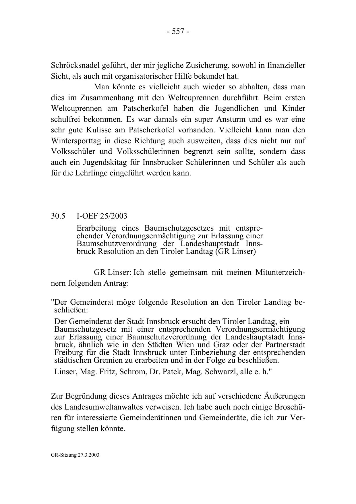 Baumschutzverordnung der Landeshauptstadt Innsbruck Resolution an den Tiroler Landtag (GR Linser)