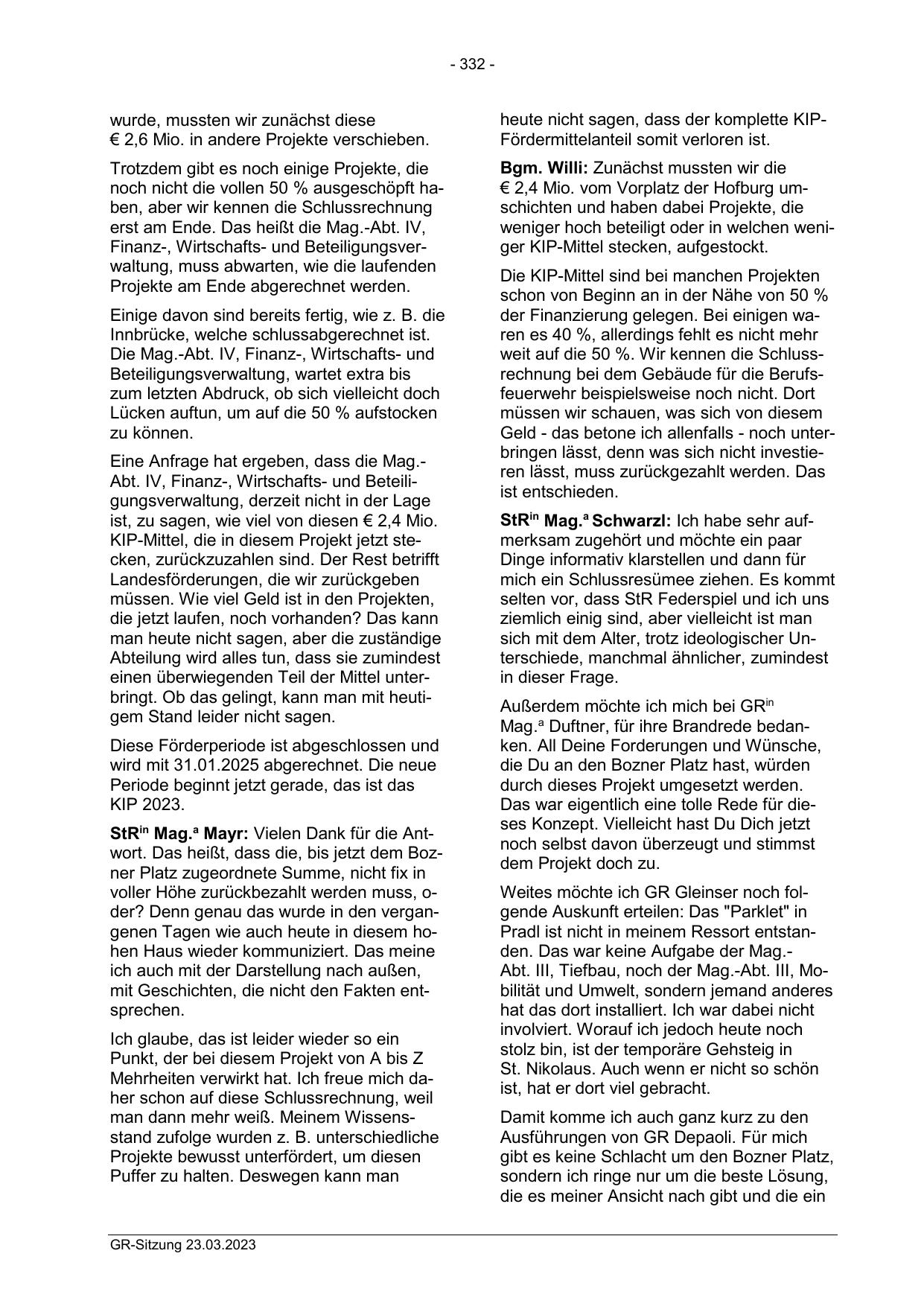 StRin Mag.a Mayr: Vielen Dank für die Antwort. Das heißt, dass die, bis jetzt dem Bozner Platz zugeordnete Summe, nicht fix in
