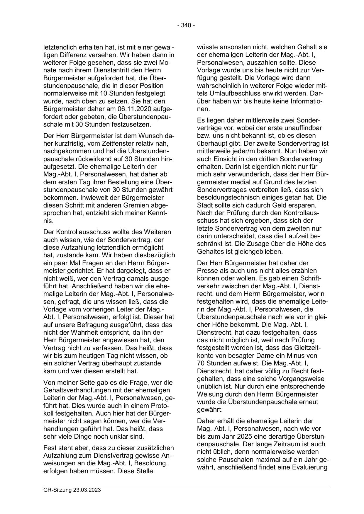 Leiterin der Mag.-Abt. I, Personalwesen, geführt hat. Dies wurde auch in einem Protokoll festgehalten. Auch hier hat der Bürgermeister nicht sagen können, wer die Verhandlungen geführt hat. Das heißt, dass
