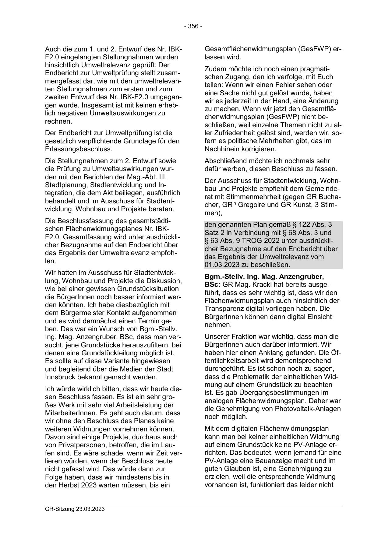Die Beschlussfassung des gesamtstädtischen Flächenwidmungsplanes Nr. IBKF2.0, Gesamtfassung wird unter ausdrücklicher Bezugnahme auf den Endbericht über