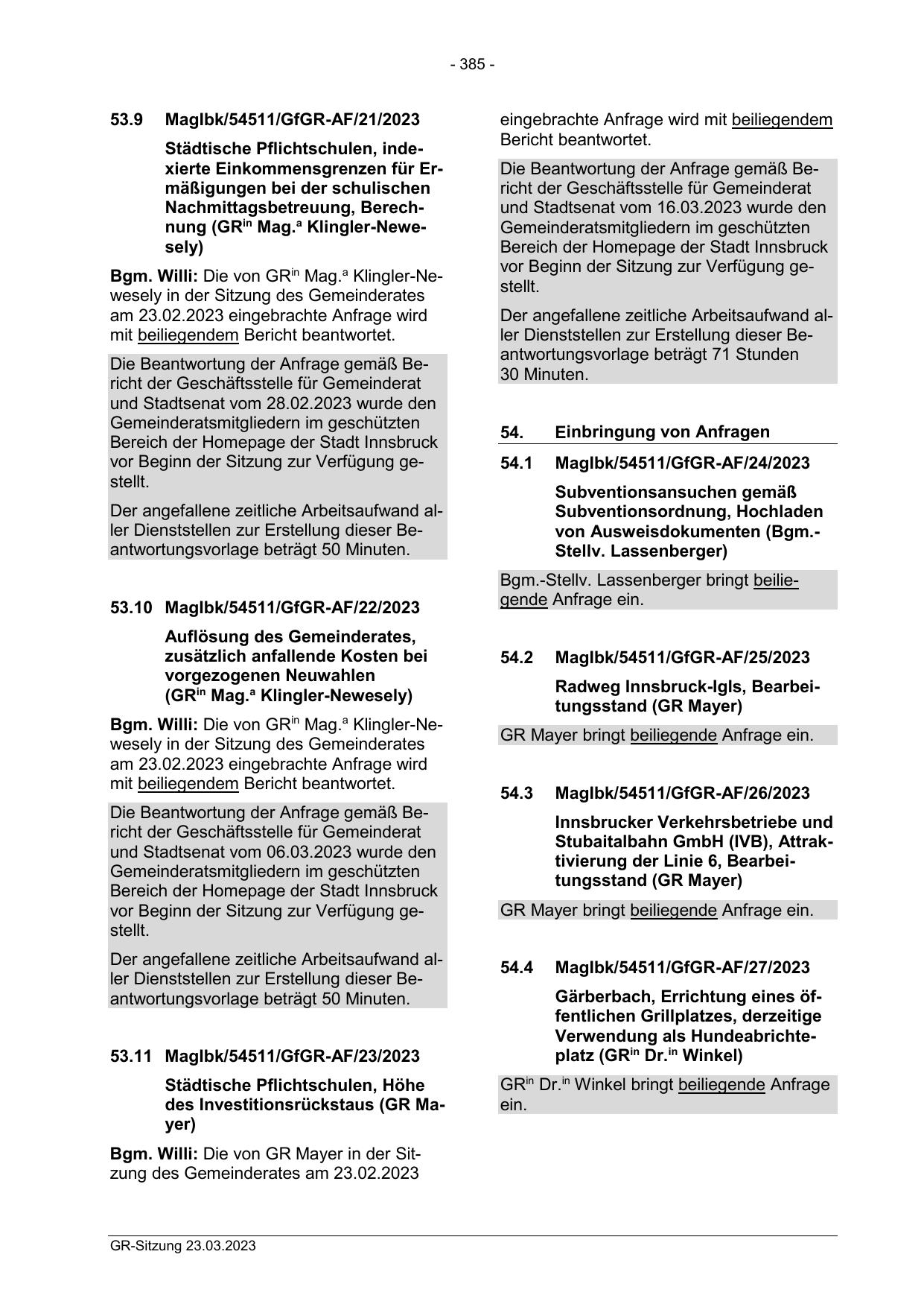 Die Beantwortung der Anfrage gemäß Bericht der Geschäftsstelle für Gemeinderat