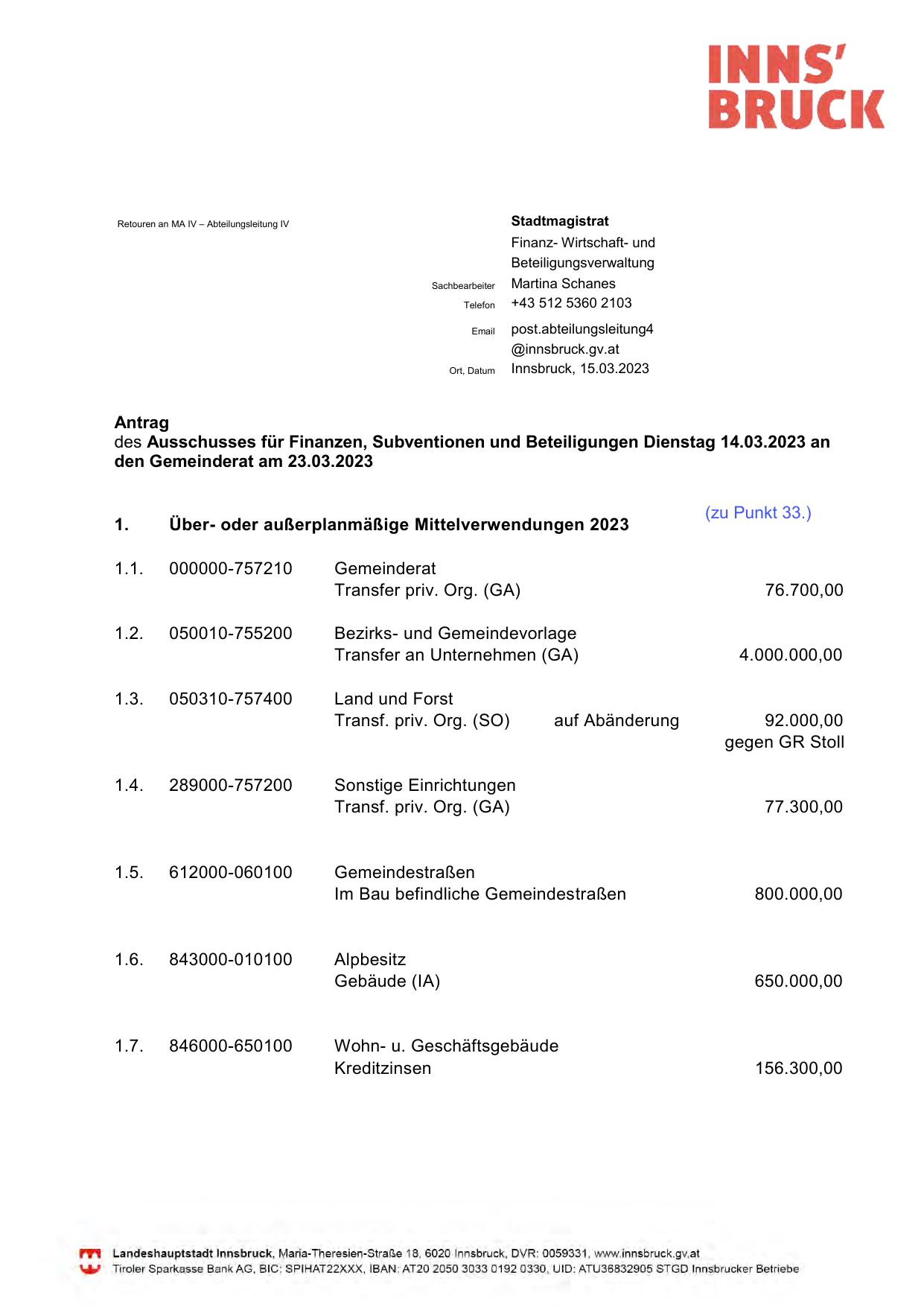 Tiroler Sparkasse Bank AG, BIC: SP IHAT22XXX, IBAN: AT20 2050 3033 0192 0330, UIO: ATU36832905 STGD lnnsbrucker Betriebe