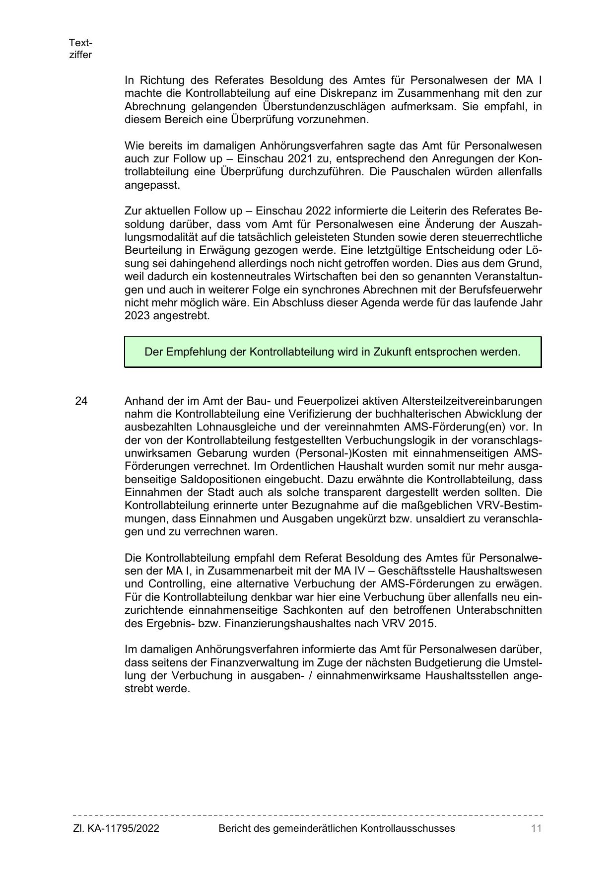 Die Kontrollabteilung empfahl dem Referat Besoldung des Amtes für Personalwesen der MA I, in Zusammenarbeit mit der MA IV – Geschäftsstelle Haushaltswesen