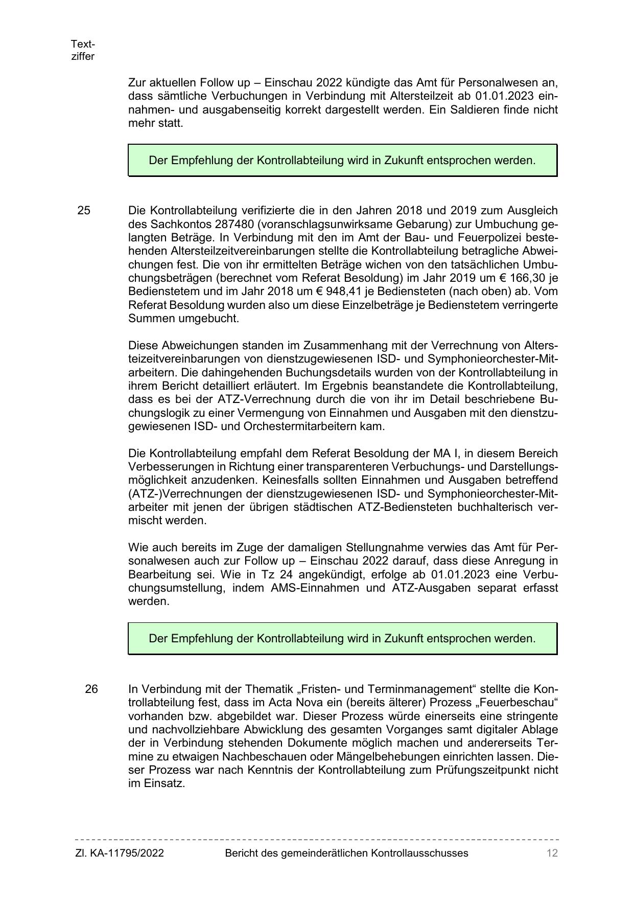 Diese Abweichungen standen im Zusammenhang mit der Verrechnung von Altersteizeitvereinbarungen von dienstzugewiesenen ISD- und Symphonieorchester-Mitarbeitern. Die dahingehenden Buchungsdetails wurden von der Kontrollabteilung in