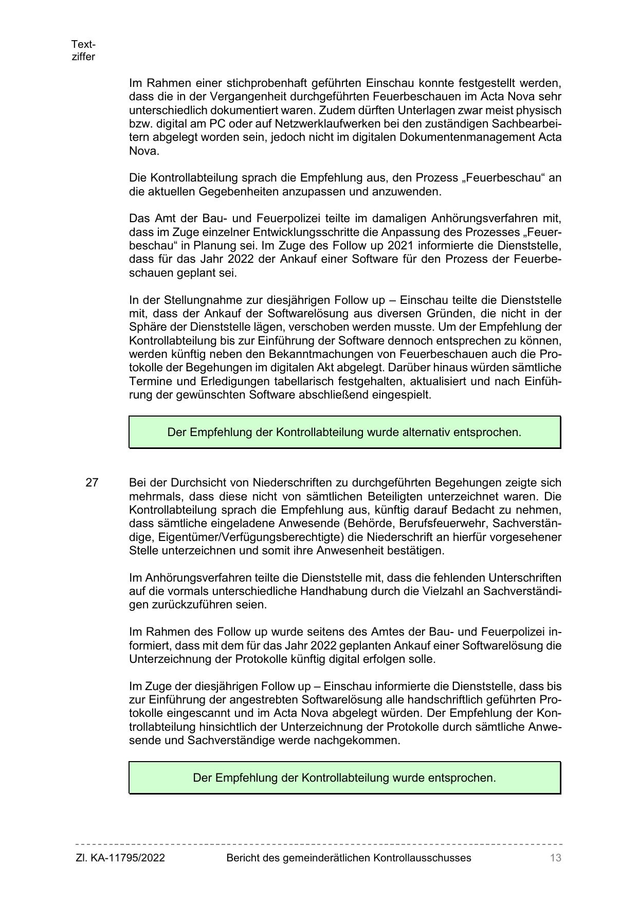 dass im Zuge einzelner Entwicklungsschritte die Anpassung des Prozesses „Feuerbeschau“ in Planung sei. Im Zuge des Follow up 2021 informierte die Dienststelle,