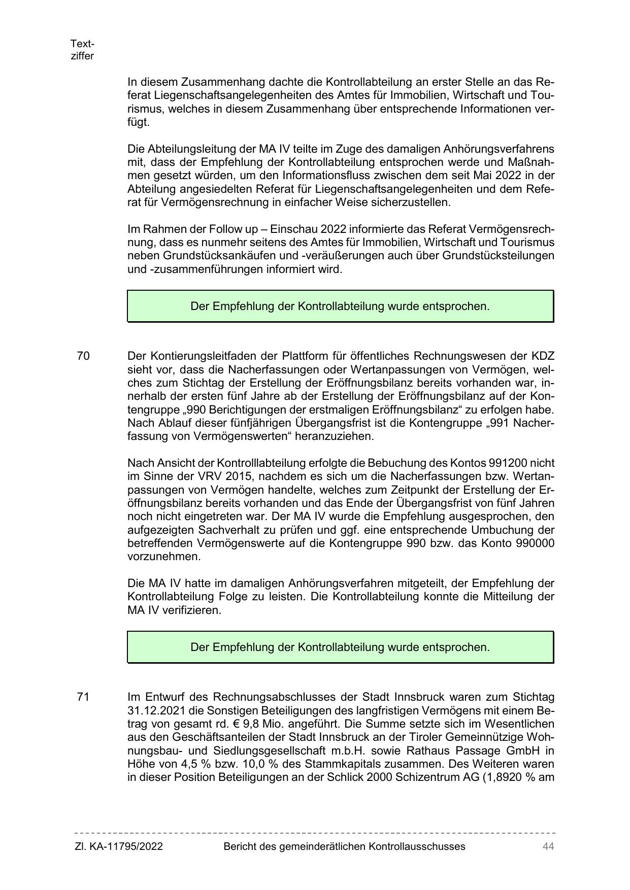 Im Rahmen der Follow up – Einschau 2022 informierte das Referat Vermögensrechnung, dass es nunmehr seitens des Amtes für Immobilien, Wirtschaft und Tourismus