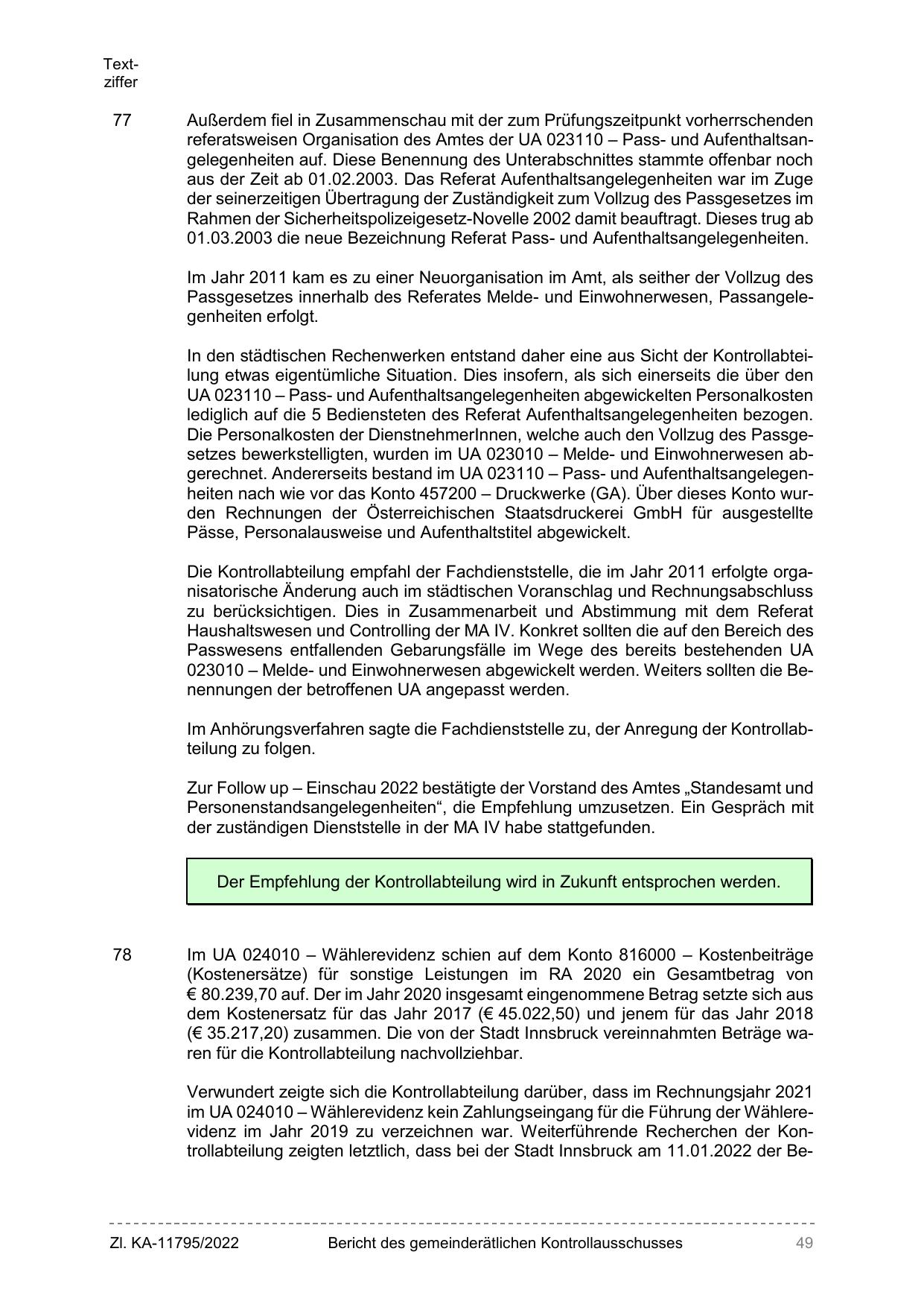 Die Personalkosten der DienstnehmerInnen, welche auch den Vollzug des Passgesetzes bewerkstelligten, wurden im UA 023010 – Melde- und Einwohnerwesen abgerechnet. Andererseits bestand im UA 023110 – Pass- und Aufenthaltsangelegenheiten nach wie vor das Konto 457200 – Druckwerke (GA). Über dieses Konto wurden Rechnungen der Österreichischen Staatsdruckerei GmbH für ausgestellte