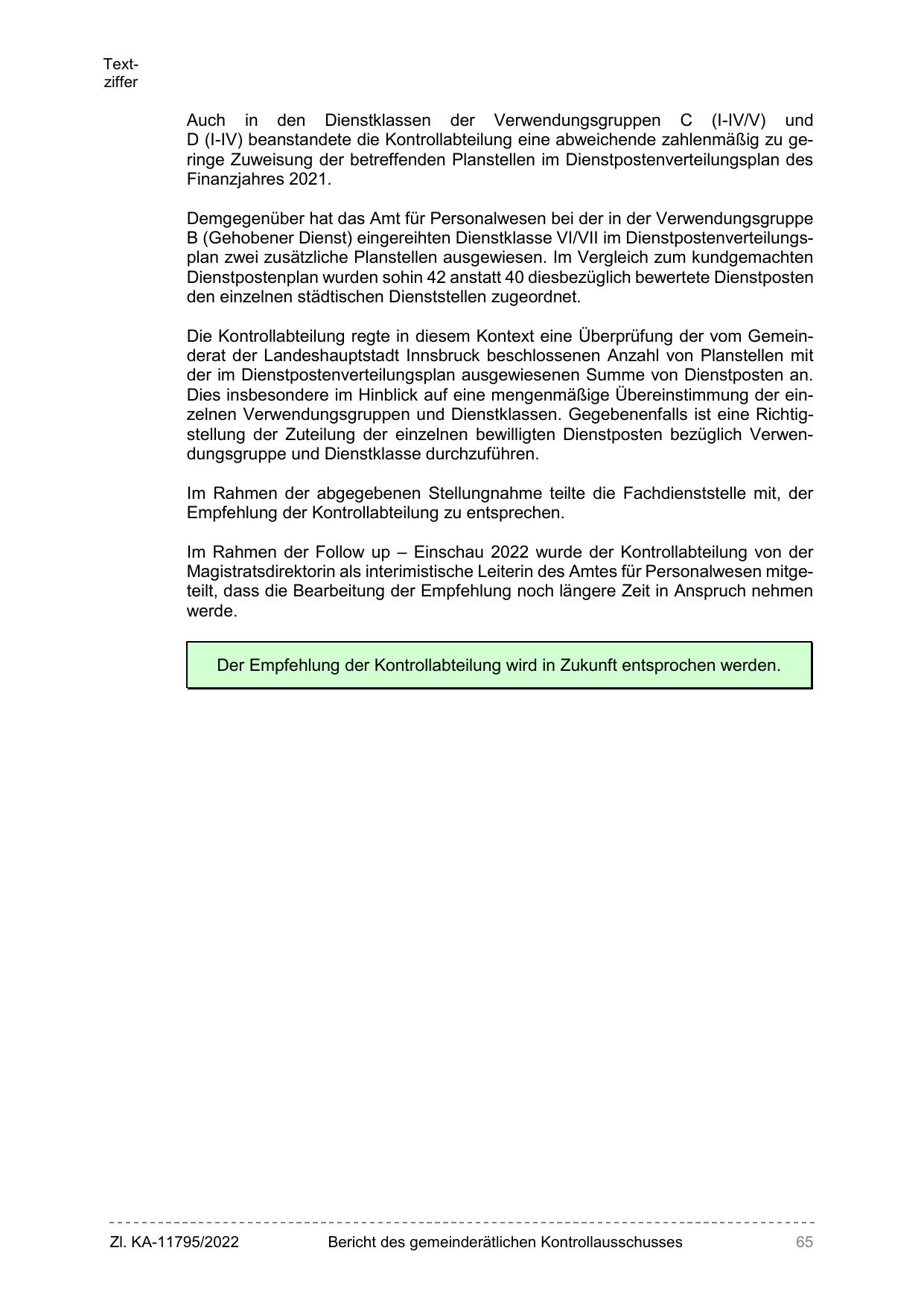 Die Kontrollabteilung regte in diesem Kontext eine Überprüfung der vom Gemeinderat der Landeshauptstadt Innsbruck beschlossenen Anzahl von Planstellen mit