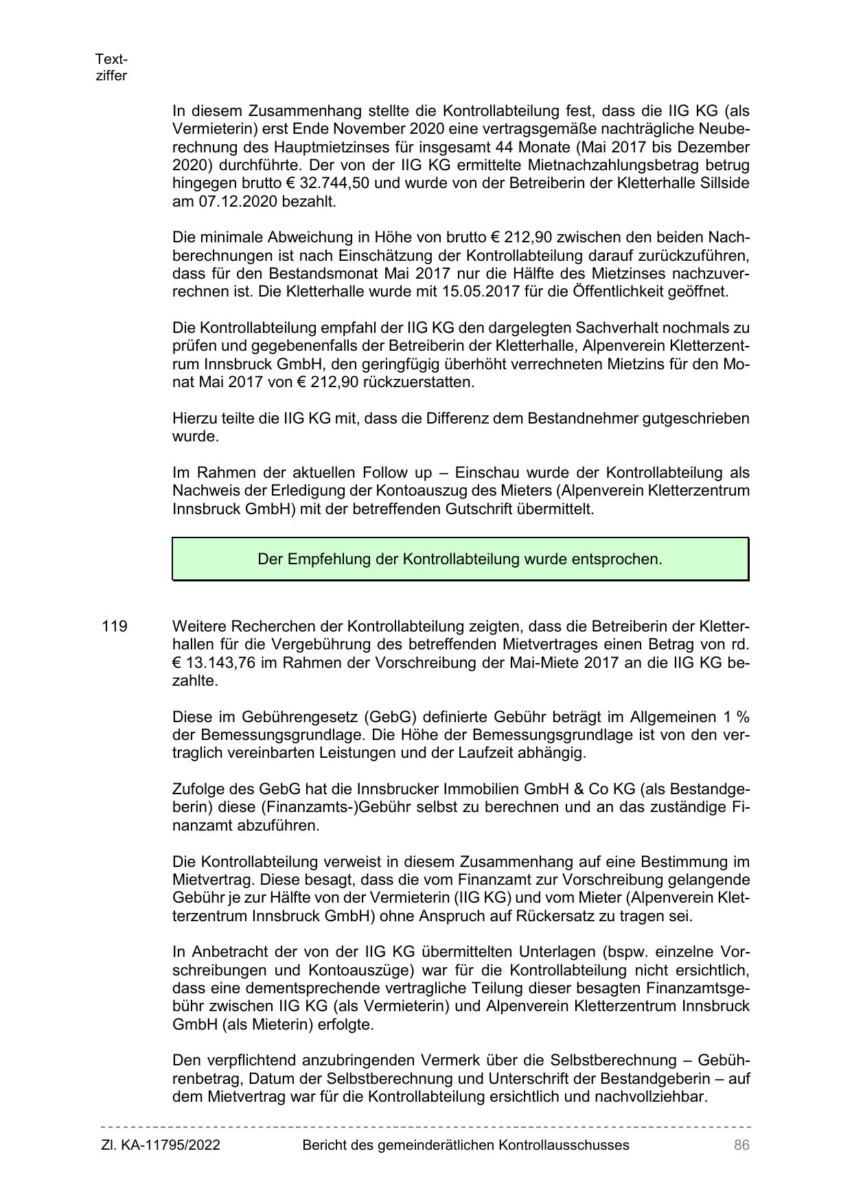 Weitere Recherchen der Kontrollabteilung zeigten, dass die Betreiberin der Kletterhallen für die Vergebührung des betreffenden Mietvertrages einen Betrag von rd.