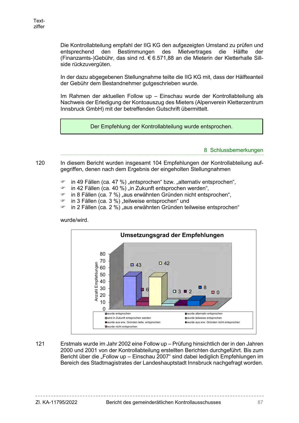 In diesem Bericht wurden insgesamt 104 Empfehlungen der Kontrollabteilung aufgegriffen, denen nach dem Ergebnis der eingeholten Stellungnahmen