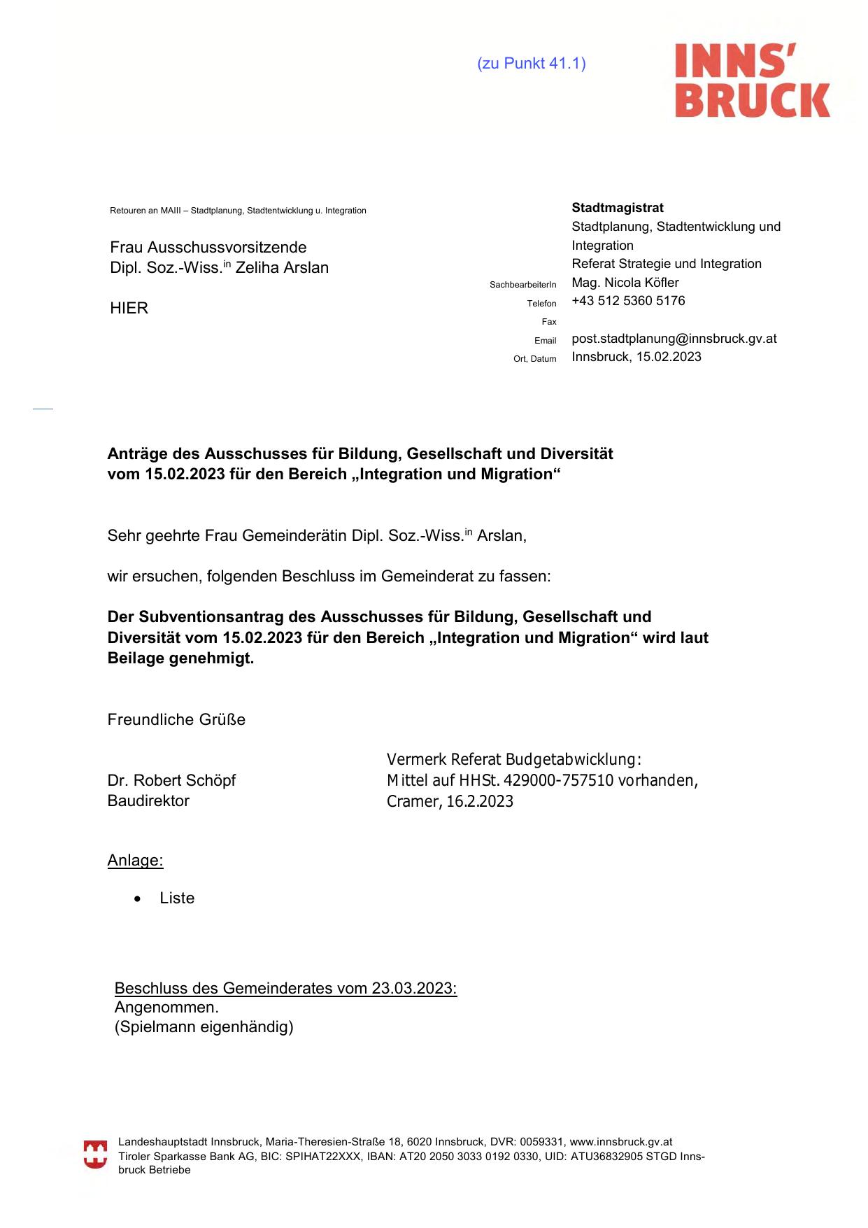 vom 15.02.2023 für den Bereich „Integration und Migration“