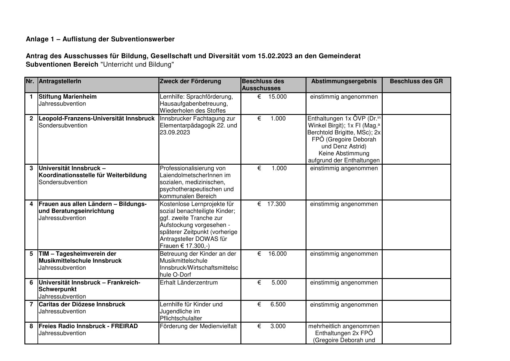 Anlage 1 – Auflistung der Subventionswerber