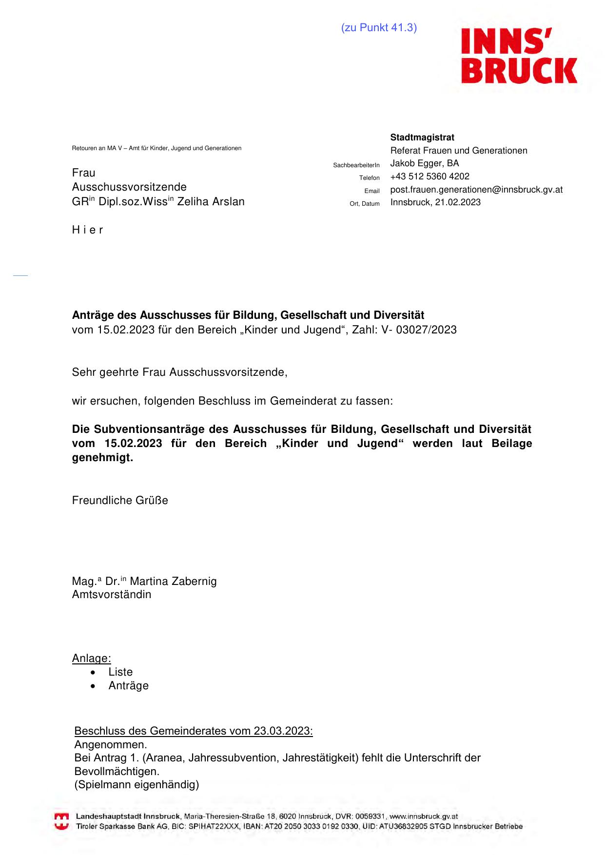 vom 15.02.2023 für den Bereich „Kinder und Jugend“, Zahl: V- 03027/2023
