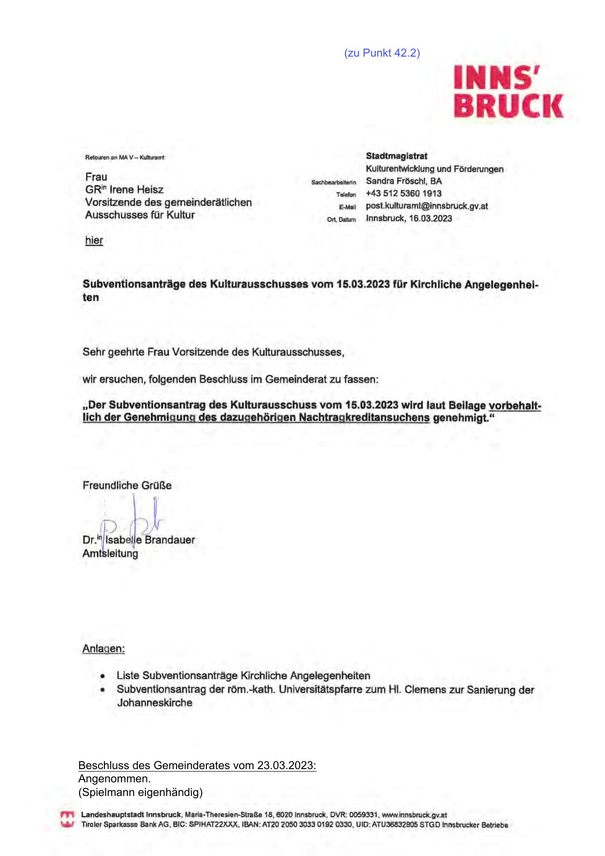 ,,Der Subventionsantrag des Kulturausschuss vom 15.03.2023 wird laut Beilage vorbehaltlich der Genehmigung des dazugehörigen Nachtragkredltansuchens genehmigt."