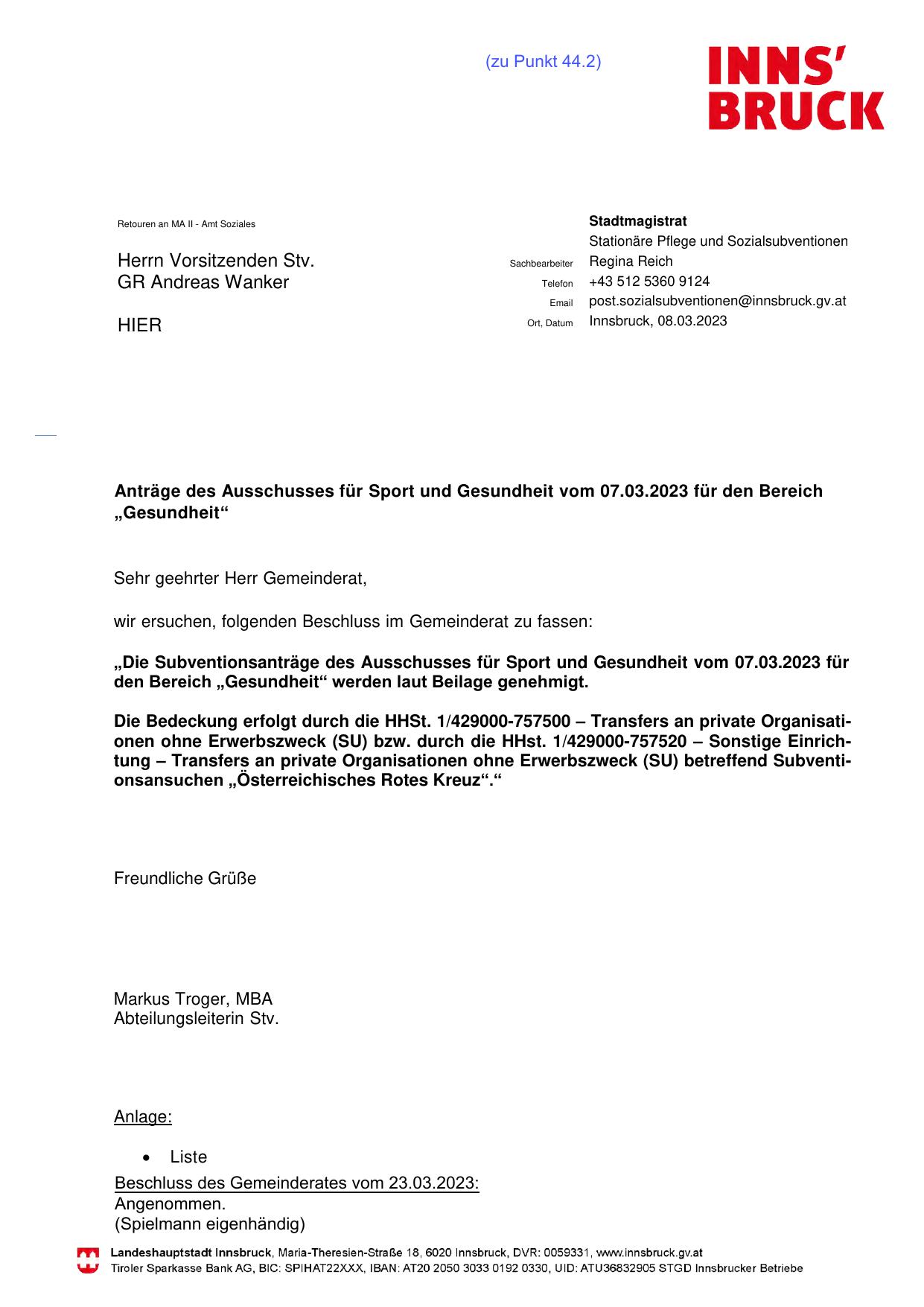 „Die Subventionsanträge des Ausschusses für Sport und Gesundheit vom 07.03.2023 für